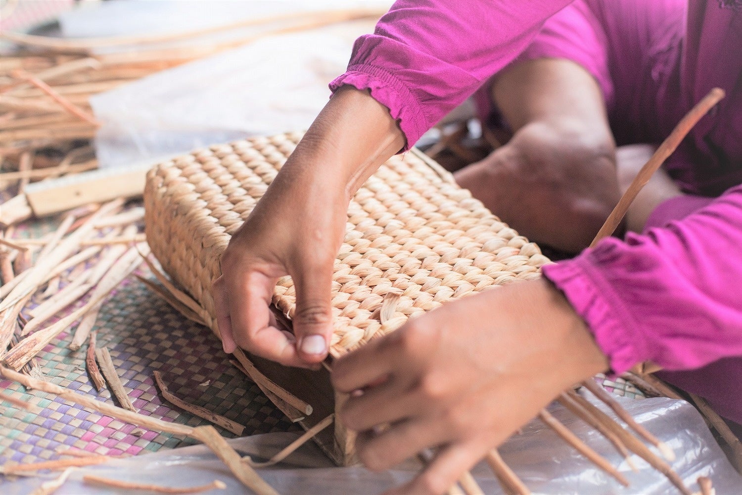 デザイナーKURUMIは、ウォーターヒヤシンスの素材を探し求めているところ、中川氏に辿り着きました。デザイナーの細かい要望や無理難題に工房が向き合い、オリジリティ―溢れる製品を生み出すことができています。