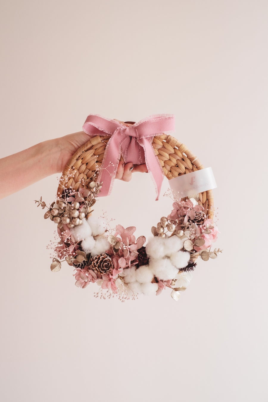 プラチナを纏ったピンクのアジサイとカスミ草がフェミニンなクリスマスを演出します。春先でも使えるデザイン。持ちの良い花たちなので長くたのしめます。