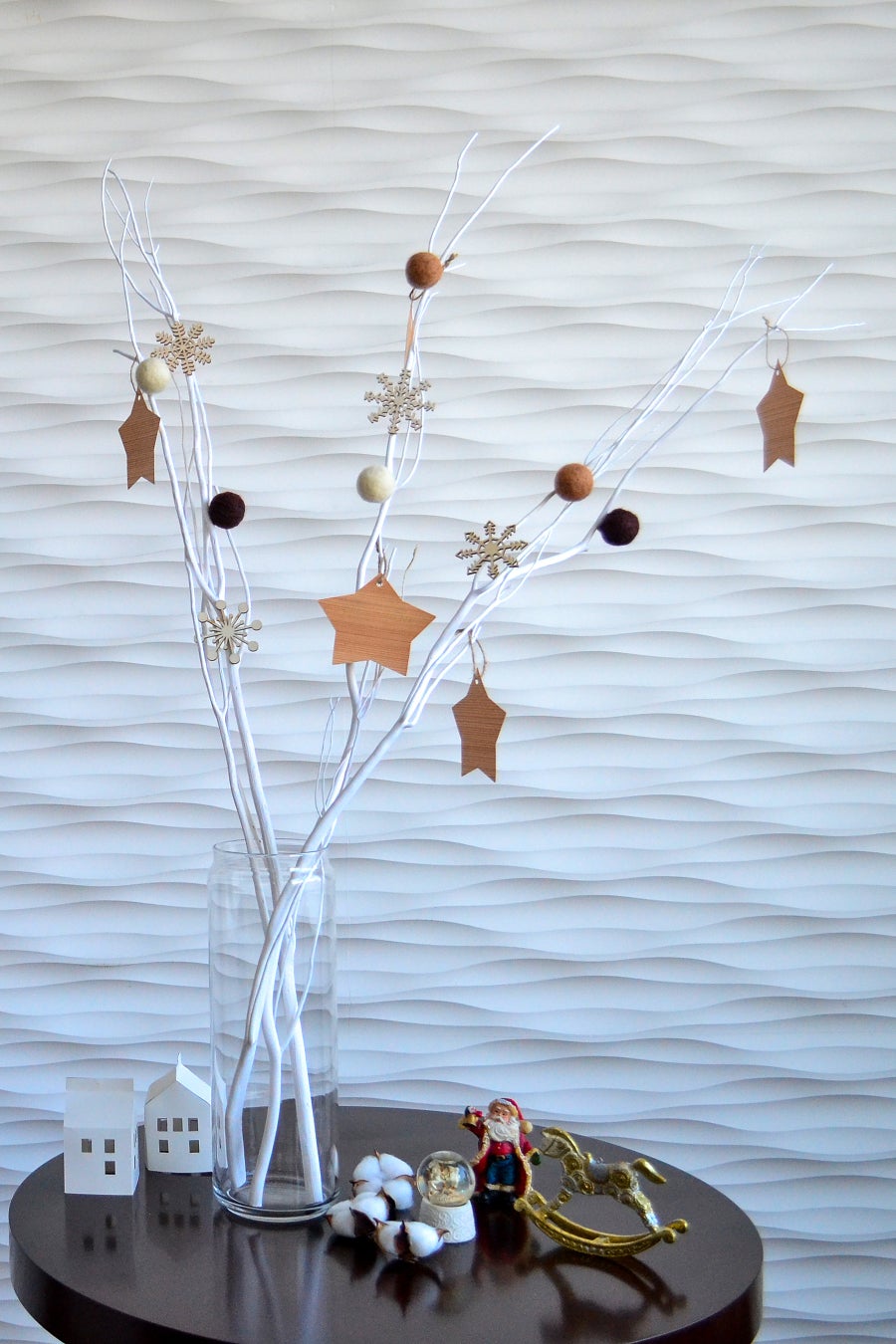 秋田杉の星型カードに想いを込める飾りつけをご自宅にも取り入れませんか。ホワイトブランチを秋田杉の星型カードやフェルトボールで飾りつけ、ぬくもりのあるクリスマスオブジェづくりをお楽しみいただけます。カードには家族でそれぞれの願い事を書いても素敵です。