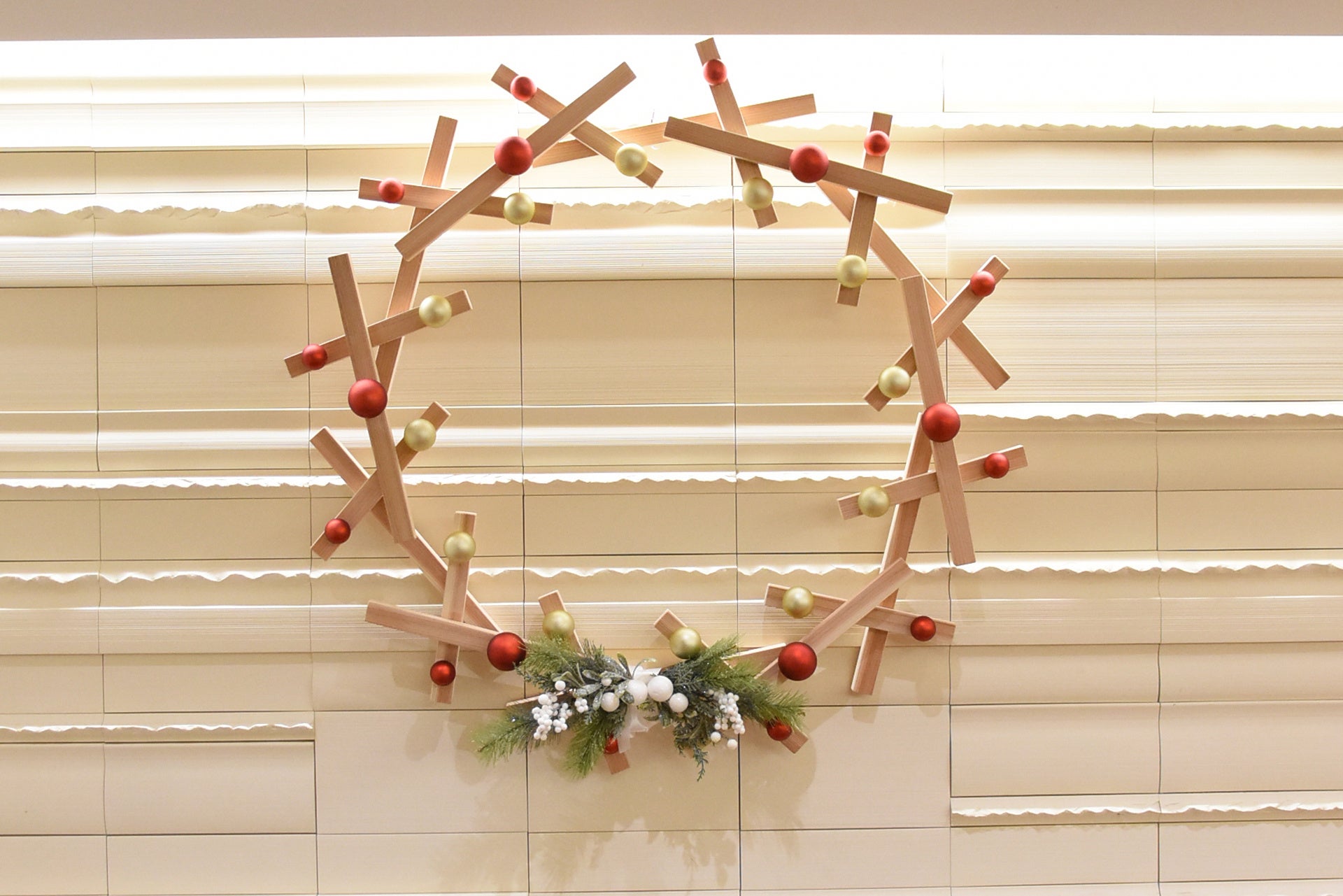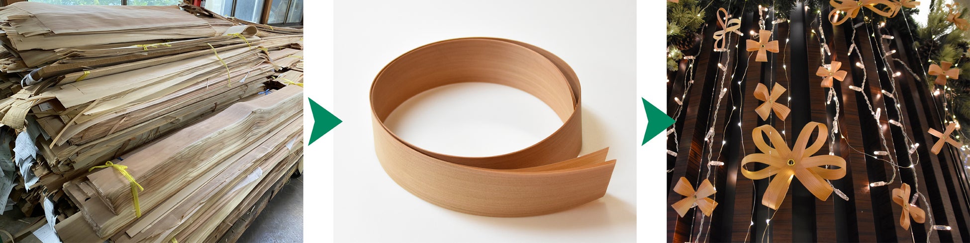 材料の木材は、すべて建築材料で天井材や外壁の下地材などに使われる秋田杉の廃棄される端材を活用しています。高さ2.7mの秋田杉クリスマスツリーをはじめ全部で19体のツリーや、直径90cmのリース、リボン状に薄く削った秋田杉でつくった300個のオーナメントなど、廃材に新たな命を吹き込み、クリスマス定番の飾りを秋田杉で再現しました。