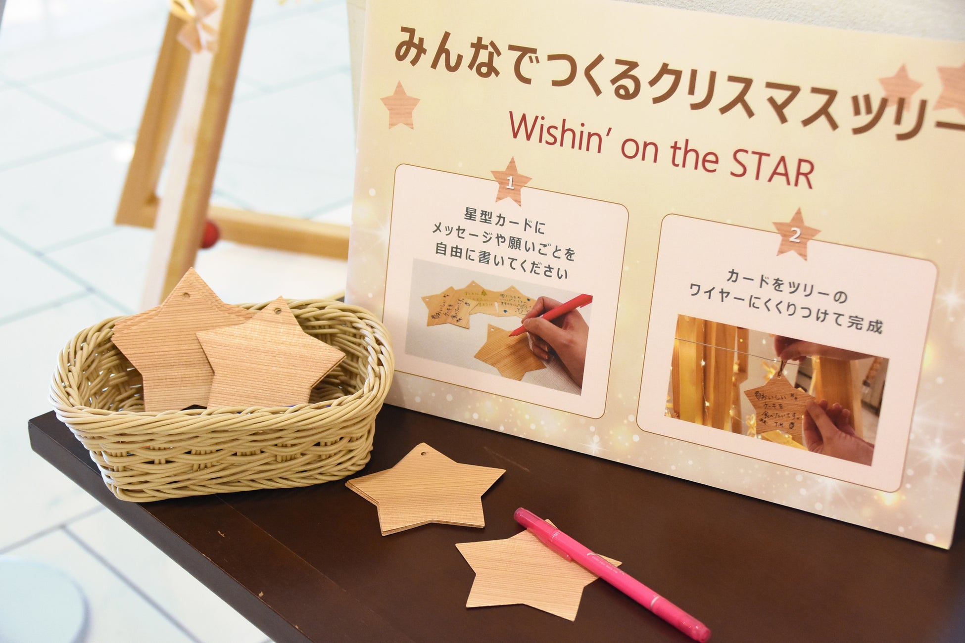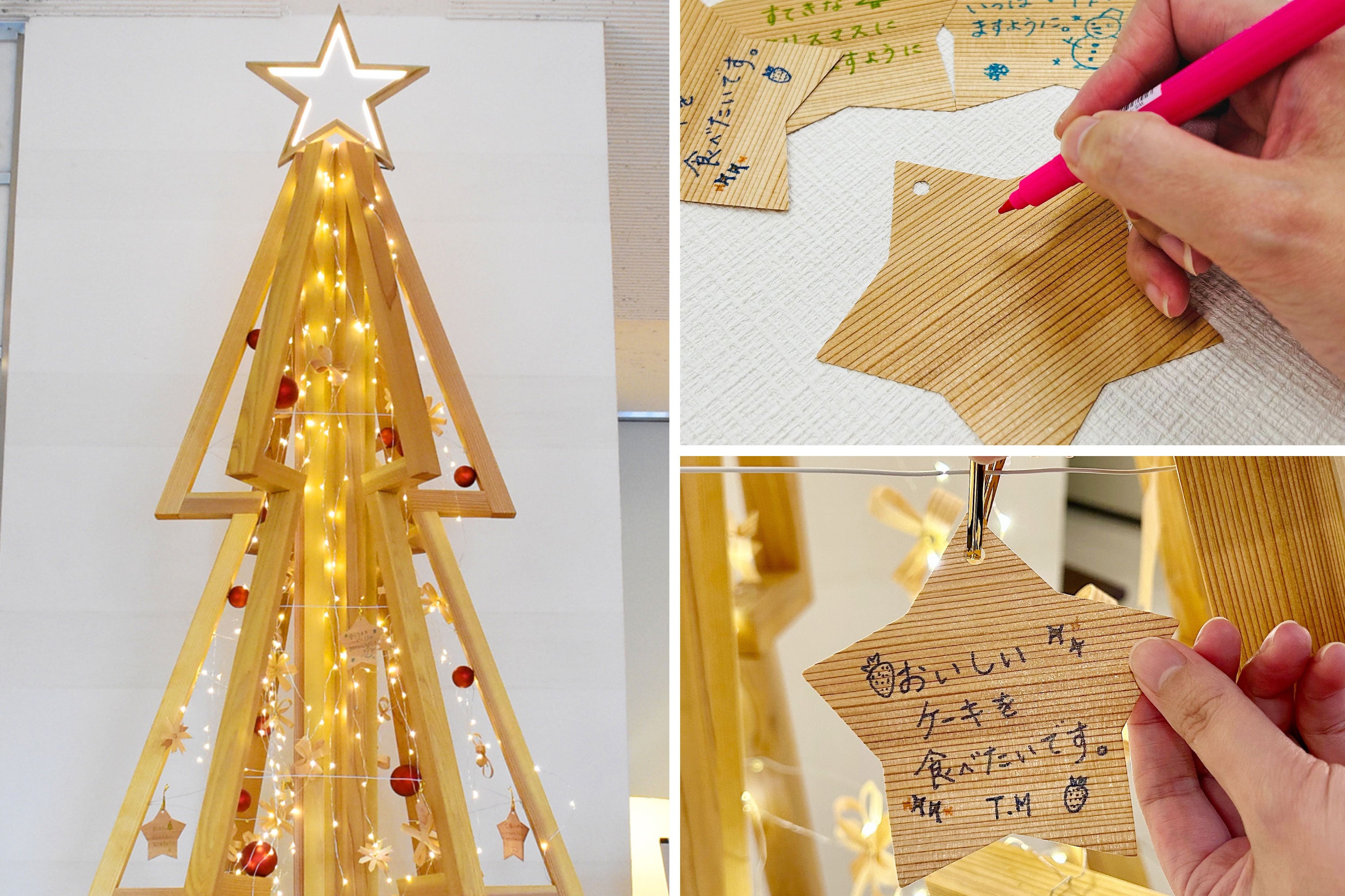 秋田杉のクリスマスツリーやクリスマスリースなどに加え、今年はお客様参加型の企画として「みんなでつくる秋田杉クリスマスツリー」を新たにご用意しました。秋田杉の端材でつくった星型のカードに願い事を書いて、高さ2.7mの秋田杉ツリーに飾り完成させるものです。12月5日(木)には、地域の保育園から子どもたちが来館し、カードの飾りつけなどを行うイベントを予定しています。