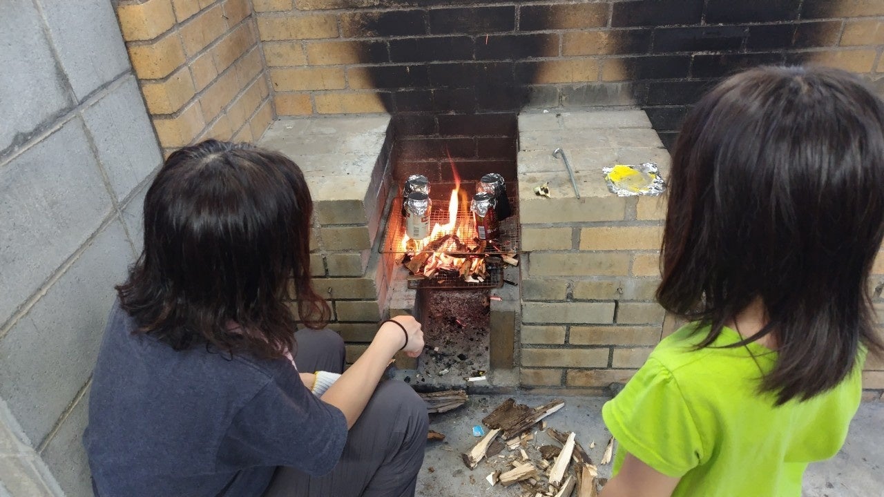 普段食べているような食べ物ばかりですが、「おいしい!」「おいしい!!」と繰り返し言いながら、みんなでキレイにたいらげました。アルミにくるんで火種の横に置いておいた焼きバナナと焼きリンゴが切られると、こども達の手が勢いよく伸びてきます。「甘くなった!」「おいしい~」とこれも大好評でした。食べ終えると食器洗いも率先して動いてくれる子どもたち。まだまだやりたい事はありますからね。どんどんいきましょう♪