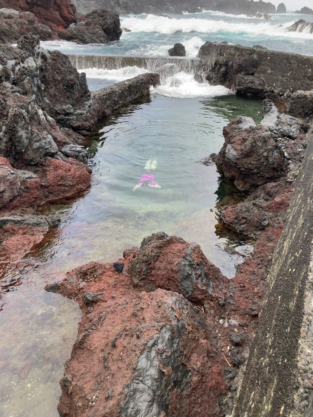 遠目に高い波が砕けるのを見て、こども達は海の中に入ることは躊躇しています。ここの安全感を知っている大人は、とりあえず魚がどれほどいるのか、海の中をチェックします。「いたいた!」と子どもたちに知らせます。一人はちょっと見てみたい。もう一人はまだ「貝を探すー」と離れてしまいました。ちょっと見てみたいほうの子が勇気を出して浅い溜まりの海の中を見てみました。「あ、さかな!!」と嬉しそう。こうして海の中を見てしまえば、その先がもっと見たくなりますね。次は深い方にチャレンジすることになります。大人が浮きを持って、子どもの身体を支えて「絶対離さないからね!」と約束します。子どもが覚悟を決めていざ岸から手を離し、顔を付けてみました。慌てた様子ですぐに岸に上がりました。しっかりその目で深い深い海の中を見たのです!!