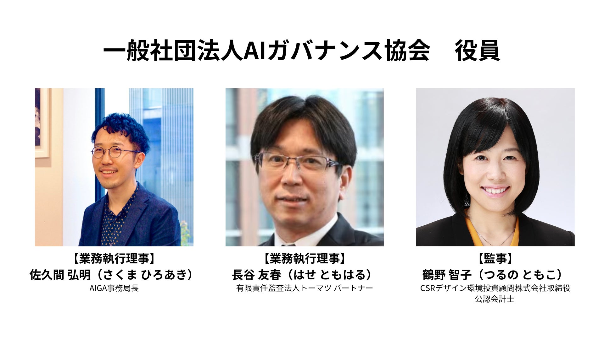 AI及びAIを用いたサービスが幅広く活用され、AIをめぐるあらゆるステークホルダーが持続可能性を伴って各自の幸福の追求や成長を実現できる社会を形成することを目的として、産業横断での議論のハブとしての活動を行うAIガバナンス協会は、2024年10月1日より、任意団体「AIガバナンス協会」から「一般社団法人AIガバナンス協会(本部:東京都中央区、代表理事:大柴行人、生田目雅史、羽深宏樹、以下「AIGA」)」へ体制を移行したことを発表いたします。