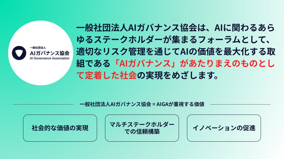 AIGAは、AI技術が持つ可能性を最大限に引き出しつつ、そのリスクを適切に管理し、持続可能な社会の実現を目指し、AIガバナンスの普及促進、社会実装に資する具体的な提言と行動を推進していきます。