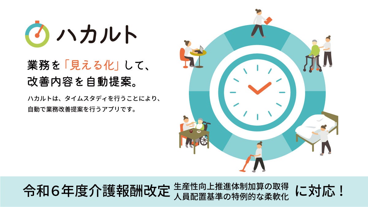 「ハカルト」は、介護事業所の業務内容と時間を見える化するタイムスタディアプリであり、有料版では、取得したデータを基に業務分析を行うことにより、生産性向上に向けた最適なICT機器の導入を提案します。