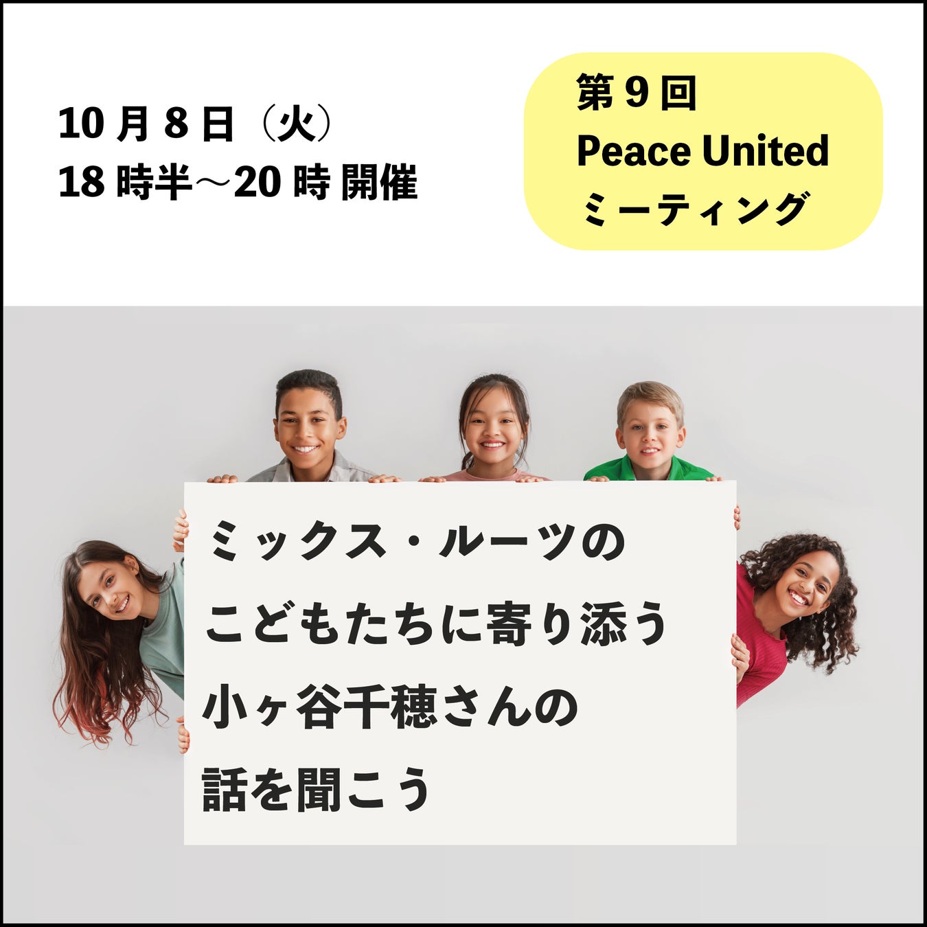 第9回目となるPeace Unitedミーティングには、日本でミックス・ルーツの家族の困りごとを解決するために彼らに寄り添い、活動している、小ヶ谷千穂さんをスピーカーとしてお招きします。