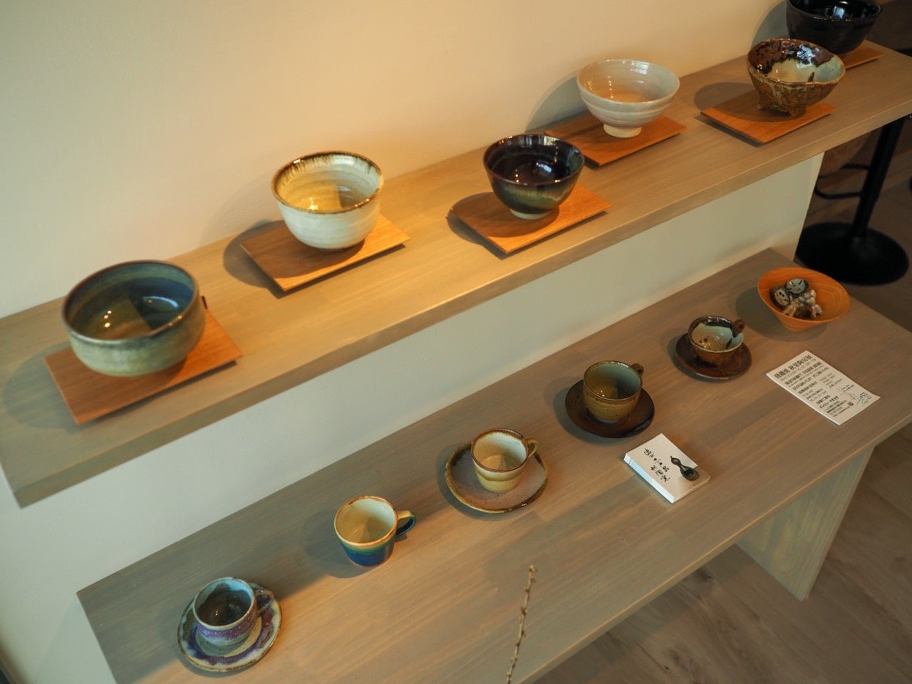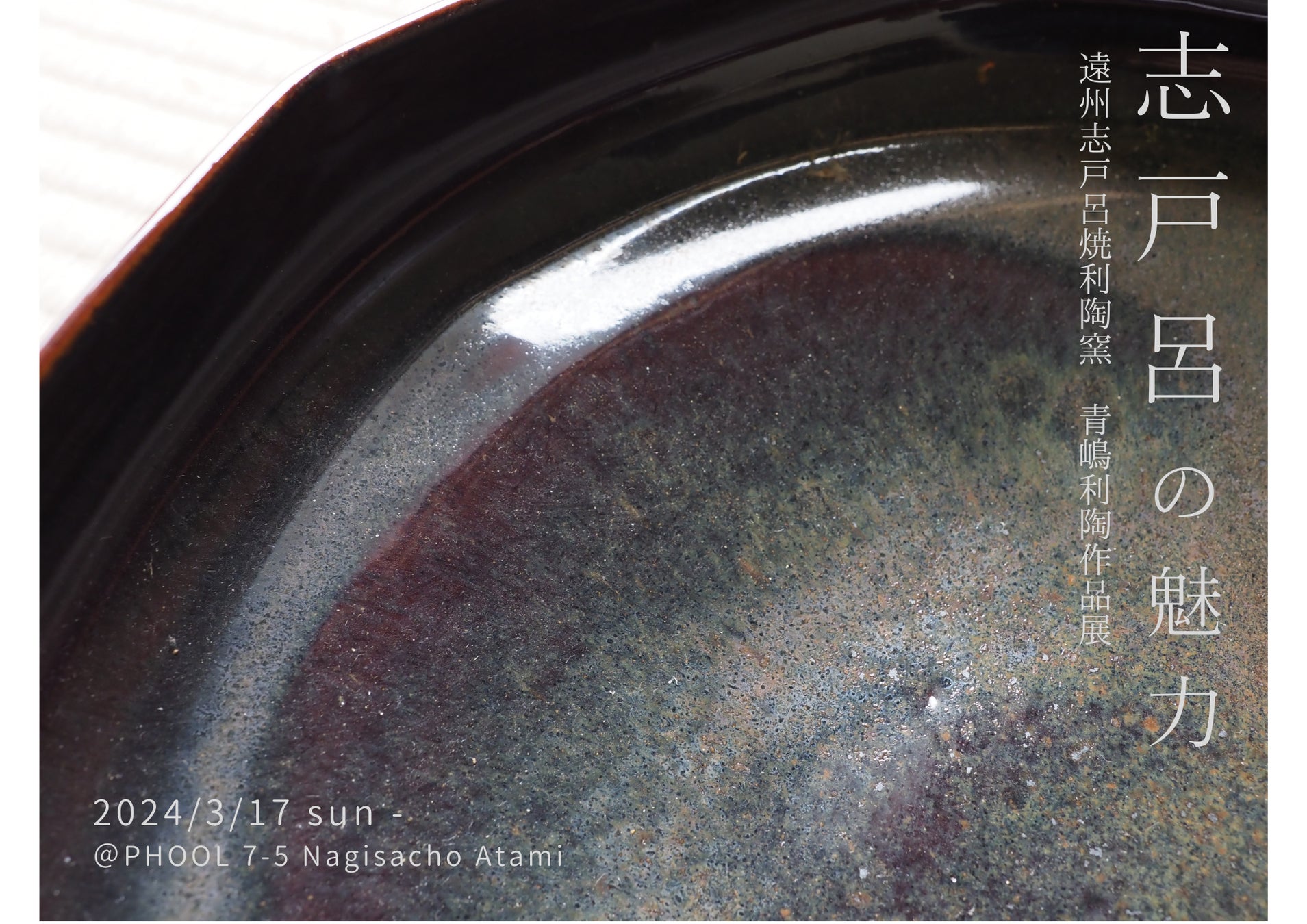 【PHOOL】店内には小さなギャラリースペースを設置しており、静岡県内でも古い歴史を持つ、「遠州志戸呂利陶窯」(静岡県島田市)の2代目・青嶋利陶氏の志戸呂焼作品を展示しています。志戸呂焼は室町時代から500年以上の歴史を持ち、徳川家康の保護を受けた後、家康の江戸時代の総合芸術家であり大名茶人である小堀遠州が好んで取り入れたという「遠州七窯」の一つとして、大切に受け継がれてきました。