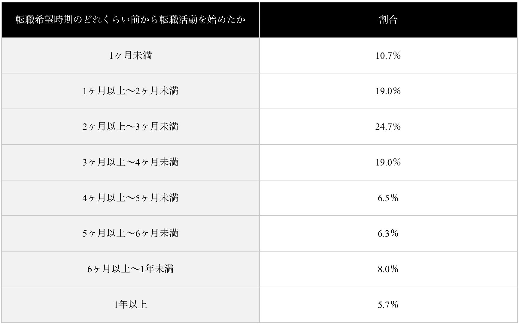 転職希望時期のどれくらい前から転職活動を始めたかを調査した結果は以下のとおりです。