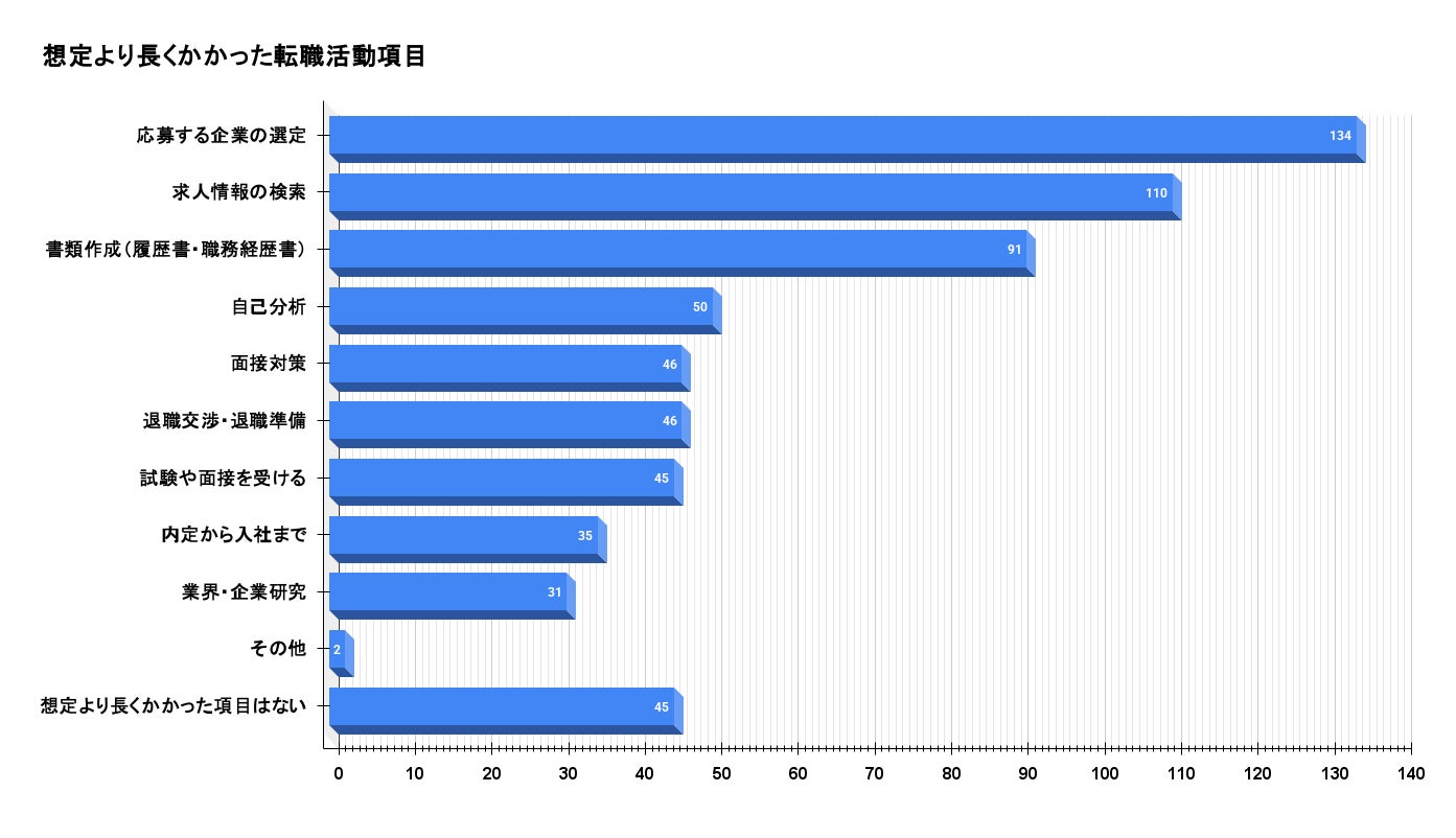 想定より長くかかった転職活動項目の結果は以下のとおりです。