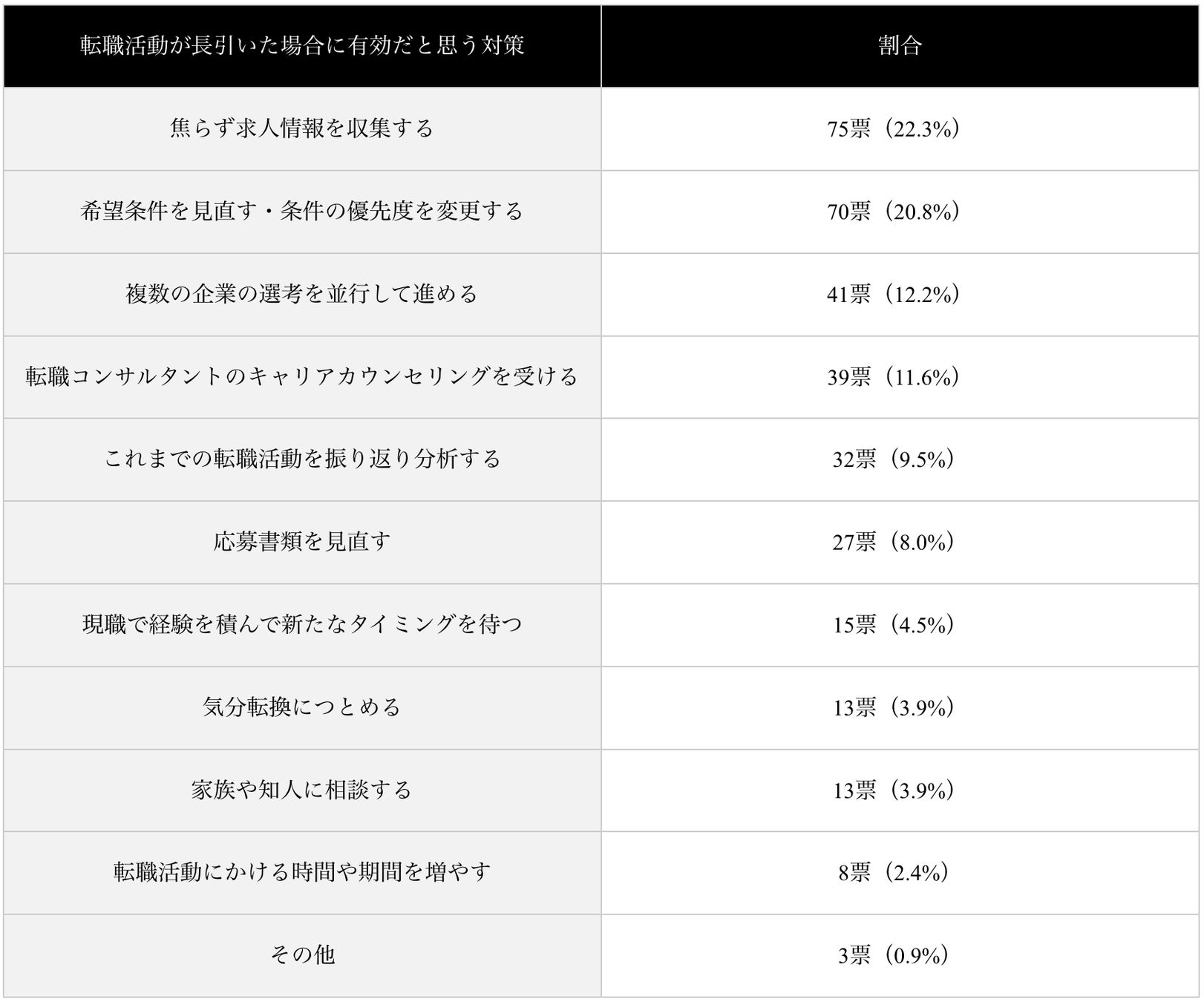 転職活動が長引いた場合に有効だと思う対策では「焦らず求人情報を収集する」「希望条件を見直す・条件の優先度を変更する」「複数の企業の選考を並行して進める」が上位3つを占めました。