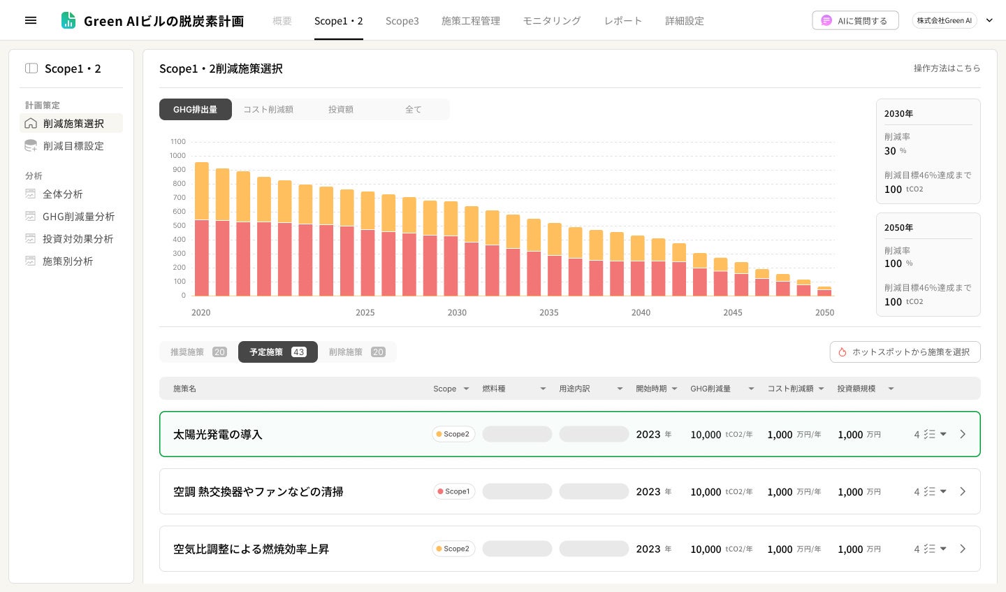 脱炭素計画策定サービス「Green AI」(https://greenai.app/) は700以上のCO2削減施策から、ユーザーの排出状況に合わせてアルゴリズムがレコメンド。さらにCO2削減量、投資回収年数などを計算。脱炭素計画策定をサポートすることで企業の『脱炭素』と『コスト削減』の両立を実現するシステムです。
