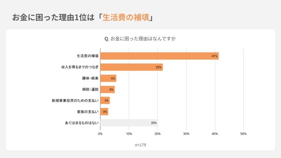 お金に困った理由について、「生活費の補填」が41%、「収入を得るまでのつなぎ」が22%という結果になりました。フリーランスは毎月の収入が安定しない傾向が強く、固定費である家賃や光熱費、食費をどう確保するかが日常的な課題であることが、この結果からうかがえます。