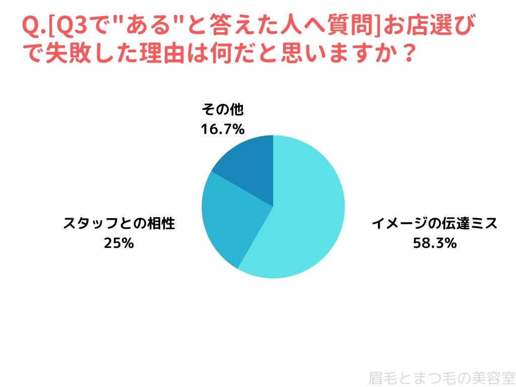 眉毛サロンのお店選びで失敗したと感じるポイントは「イメージの伝達ミス(58.3%)」がトップでした。「スタッフとの相性(25%)」を選ぶ人も。