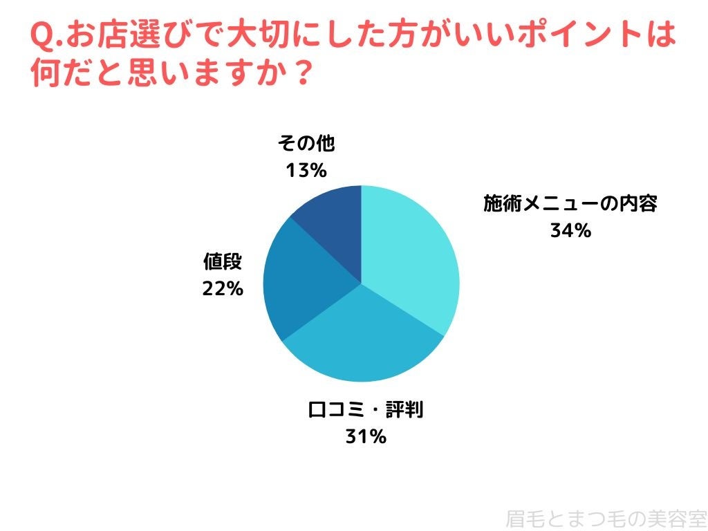 お店選びで大切なポイントをお聞きしたところ「施術メニューの内容(34%)」、「口コミ・評判(31%)」、「値段(22%)」という結果になりました。