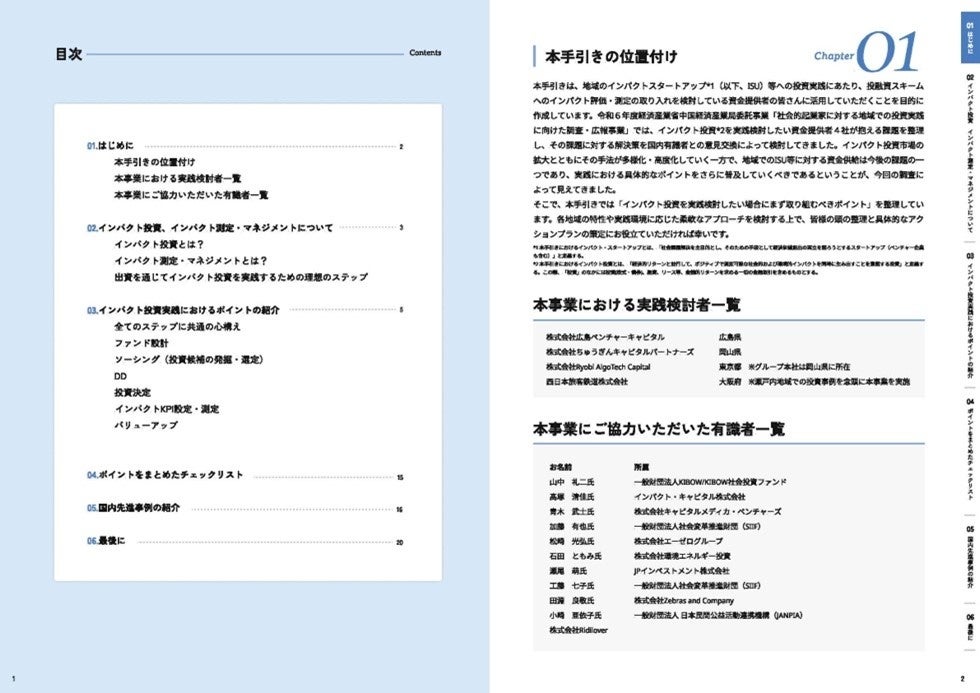 そこで、「J-Startup WEST」事務局を運営する中国経済産業局では、ISU(候補を含む)へのインパクト投資※を実際に実践検討していきたい地域の投資家・事業会社が、投融資スキームへのインパクト評価・測定を取り入れ、リスク・リターン・社会的インパクトを投資実行の検討軸としていくために必要な整理事項・投資実行の前後で必要となる起業家への支援内容などを調査しました。
