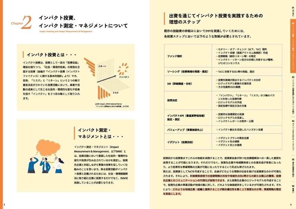 今回の事業では、「経済的リターンと並行して、ポジティブで測定可能な社会的および環境的インパクトを同時に生み出すことを意図する投資」と定義しています。
