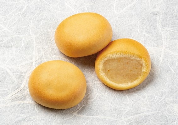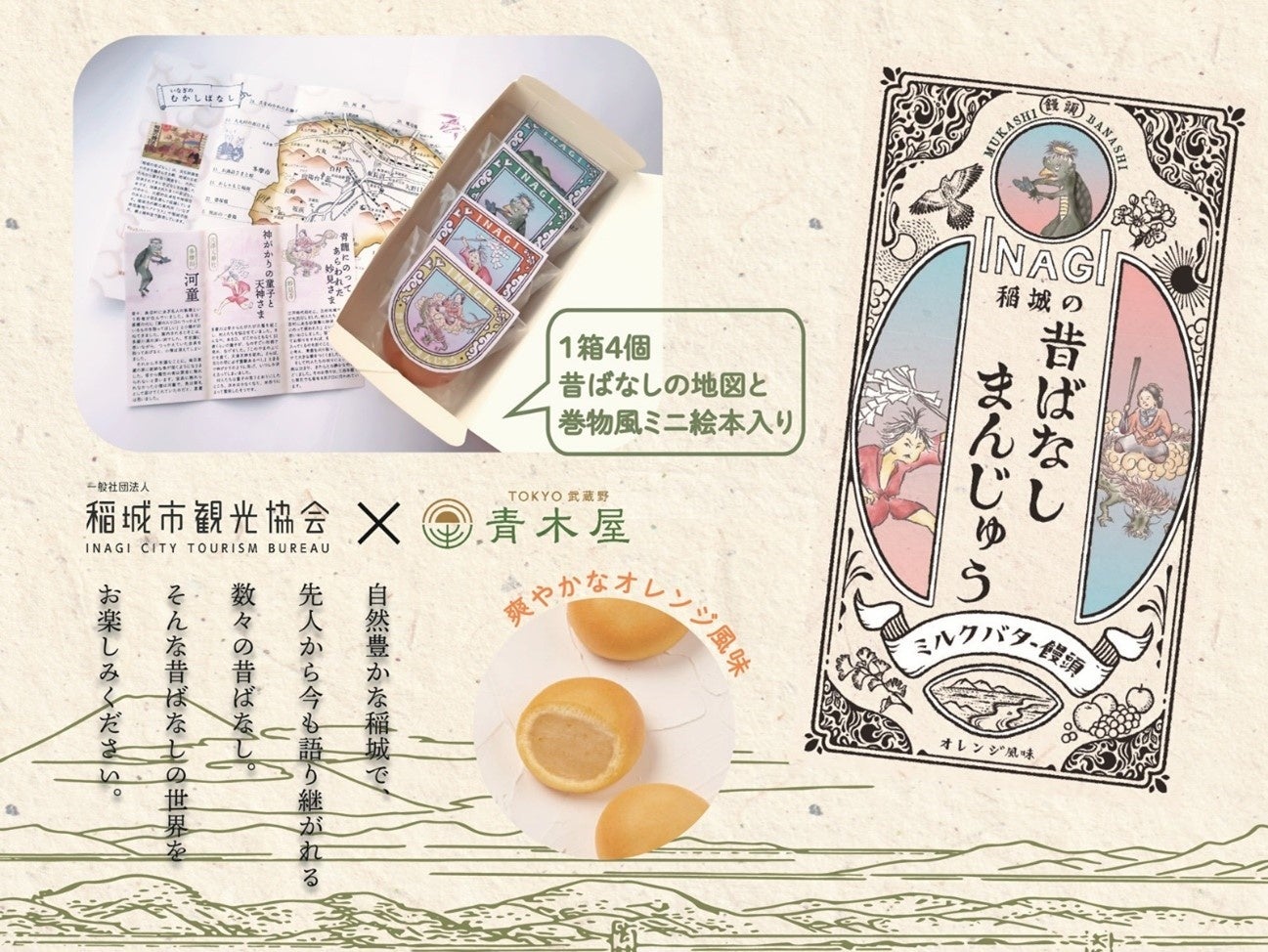中は、老舗菓子店「青木屋」のオレンジの香り広がるしっとり食感のミルクバターまんじゅうです。掛け紙の裏は、昔ばなし30話のスポットを紹介した古地図になっており、箱の中には、代表的な昔ばなし3話の巻物風ミニ絵本が入っています。
