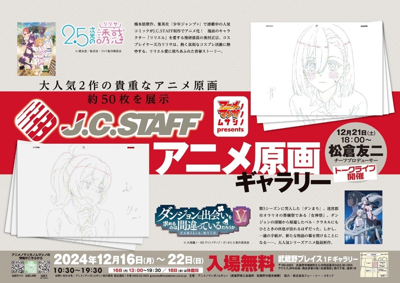 今回展示する題材は人気作、『2.5次元の誘惑』『ダンジョンに出会いを求めるのは間違っているだろうかV』の2作品。展示される原画は約50点です。普段見ることのできない貴重な原画を、この機会にぜひご覧下さい。会期中の12月21日(土)18時からは、原画ギャラリー会場にてJ.C.STAFFのチーフプロデューサー、松倉友二さんによる、アニメ制作の秘密を解き明かすトークライブも開催されます。