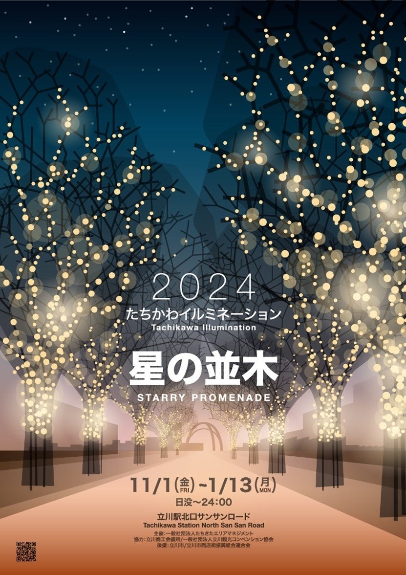 これまで長い間立川の冬を彩ってきた「Tachikawa燦燦Illumination」をパワーアップし、サンサンロードを中心としたイルミネーション「2024 たちかわイルミネーション 星の並木」を開催。サンサンロードに並ぶ木々が、約60万球のイルミネーションで彩られています。