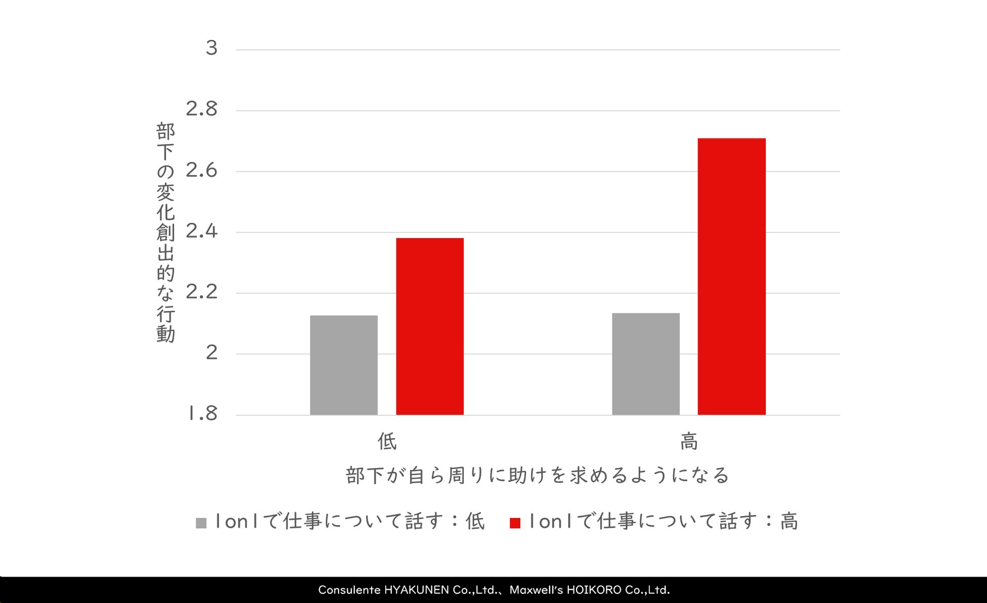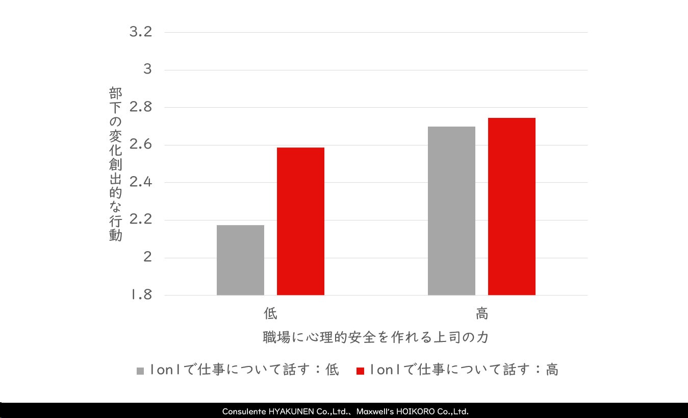 逆に左の2つの棒グラフは、その高さが大きく異なっています。これは、心理的安全づくりが苦手な上司の場合、仕事について話す1on1を行うことで、部下の変化創出的な行動を増やすことができるという事実を示しています。