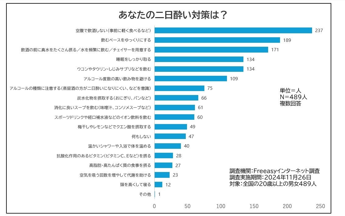 2024年11月、大正製薬株式会社が「二日酔いの経験がある」人489人を対象に「取り入れている二日酔い対策」について調査したところ、多い順に「空腹で飲酒しない(事前に軽く食べるなど)」237人、「飲むペースをゆっくりにする」189人、「飲酒の前に真水をたくさん摂る/水を頻繁に飲む/チェイサーを用意する」171人、「睡眠をしっかり取る」と「ウコンやタウリン・しじみサプリなどを飲む」が同列で134人という順でした。