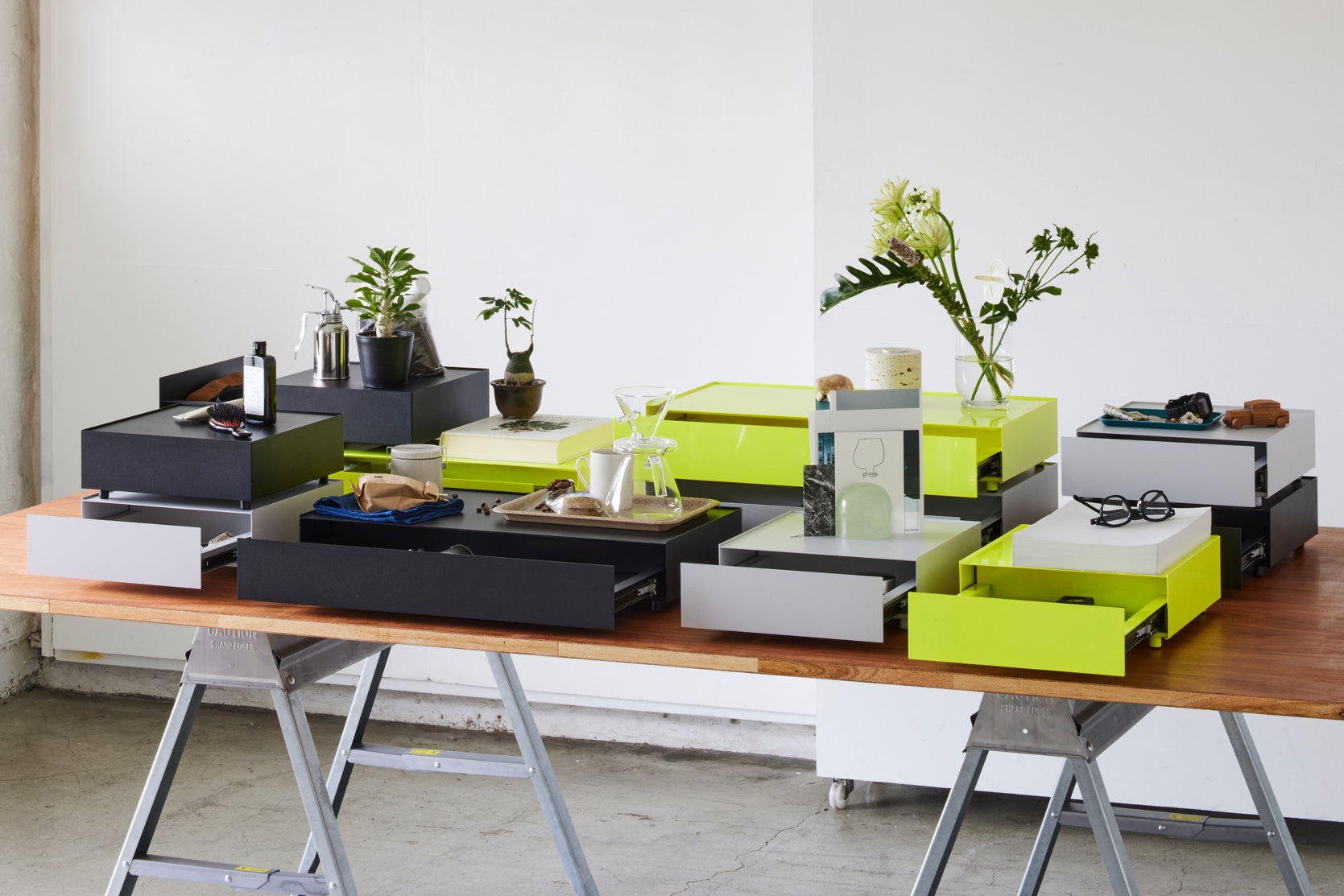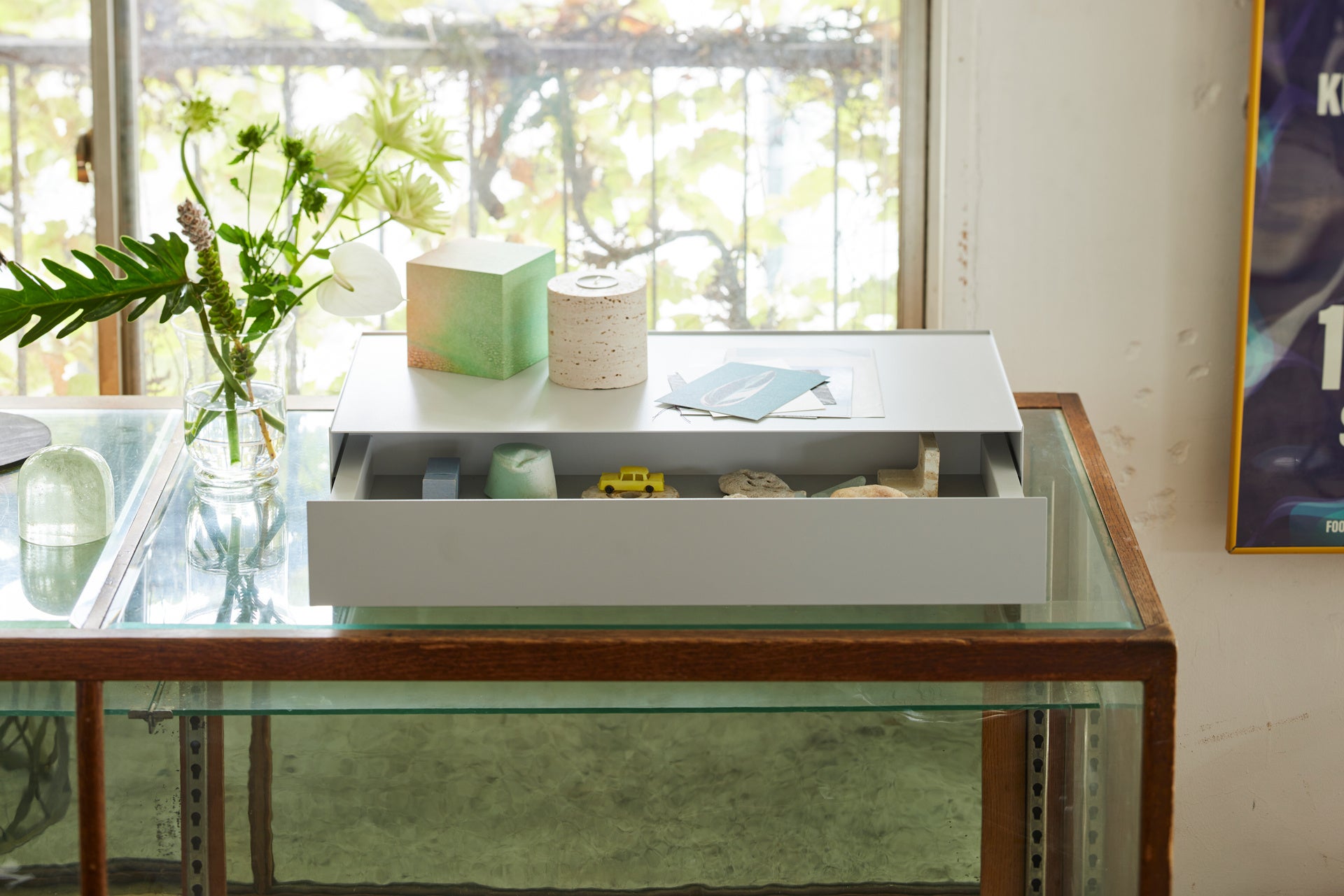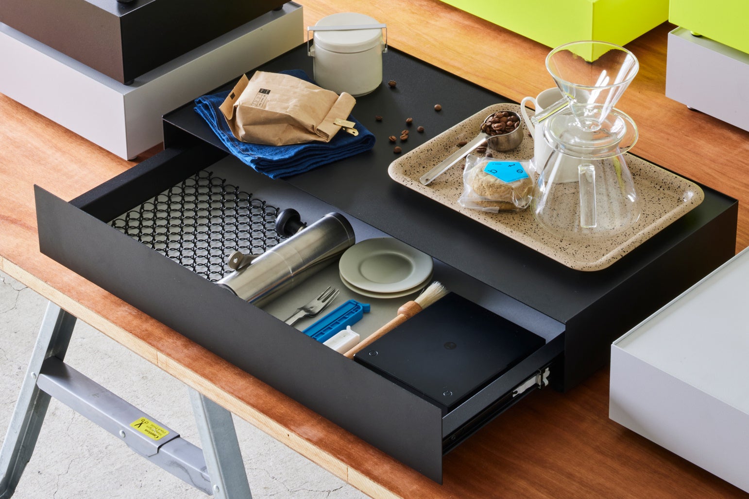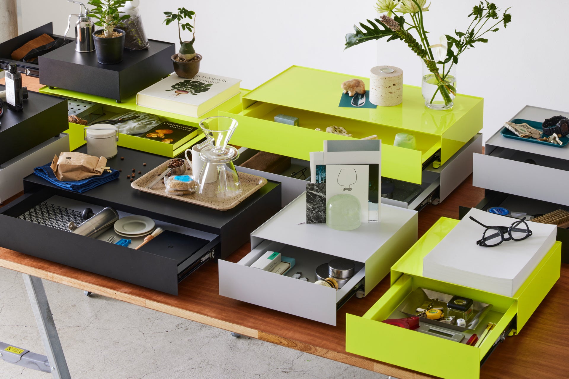 「お気に入りのものを飾りたい」「見せたくないものを隠したい」という2つの要求に、1つの場所で応えられるよう考案されたのが「KaKuKo」です。オフィス用キャビネットを長年作り続けてきたダイシン工業の技術を生かし、一段だけの引き出しに、十分な耐荷重性能を持つ天面を備え「みせる」と「かくす」が自然な形で同居する新しい収納システムを作りました。
