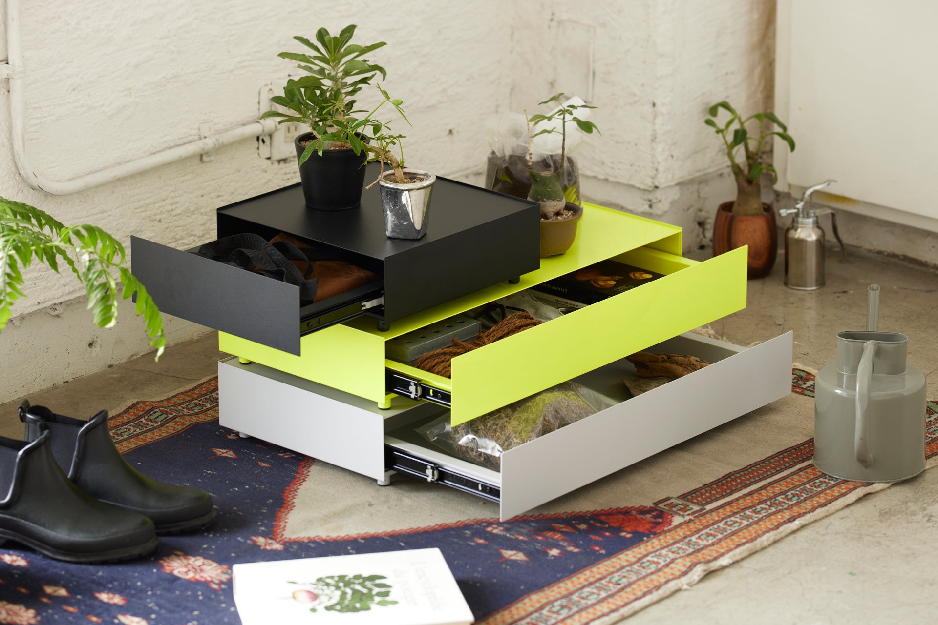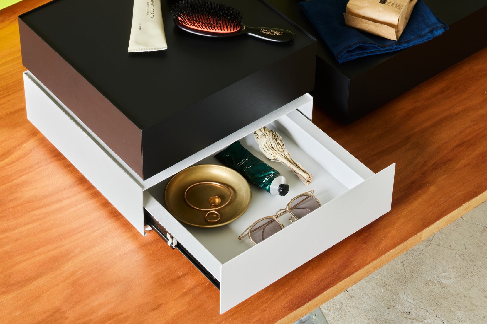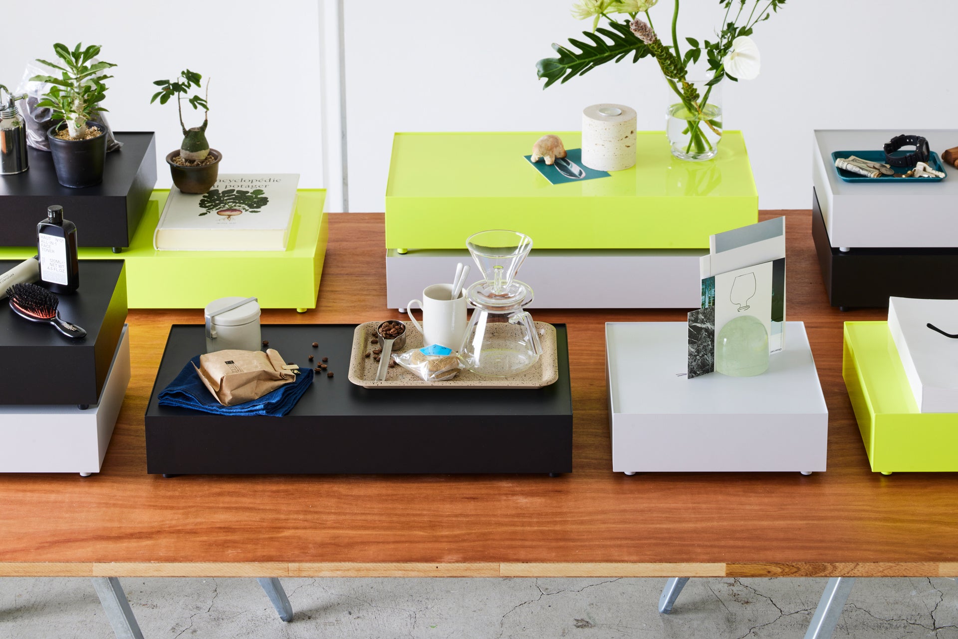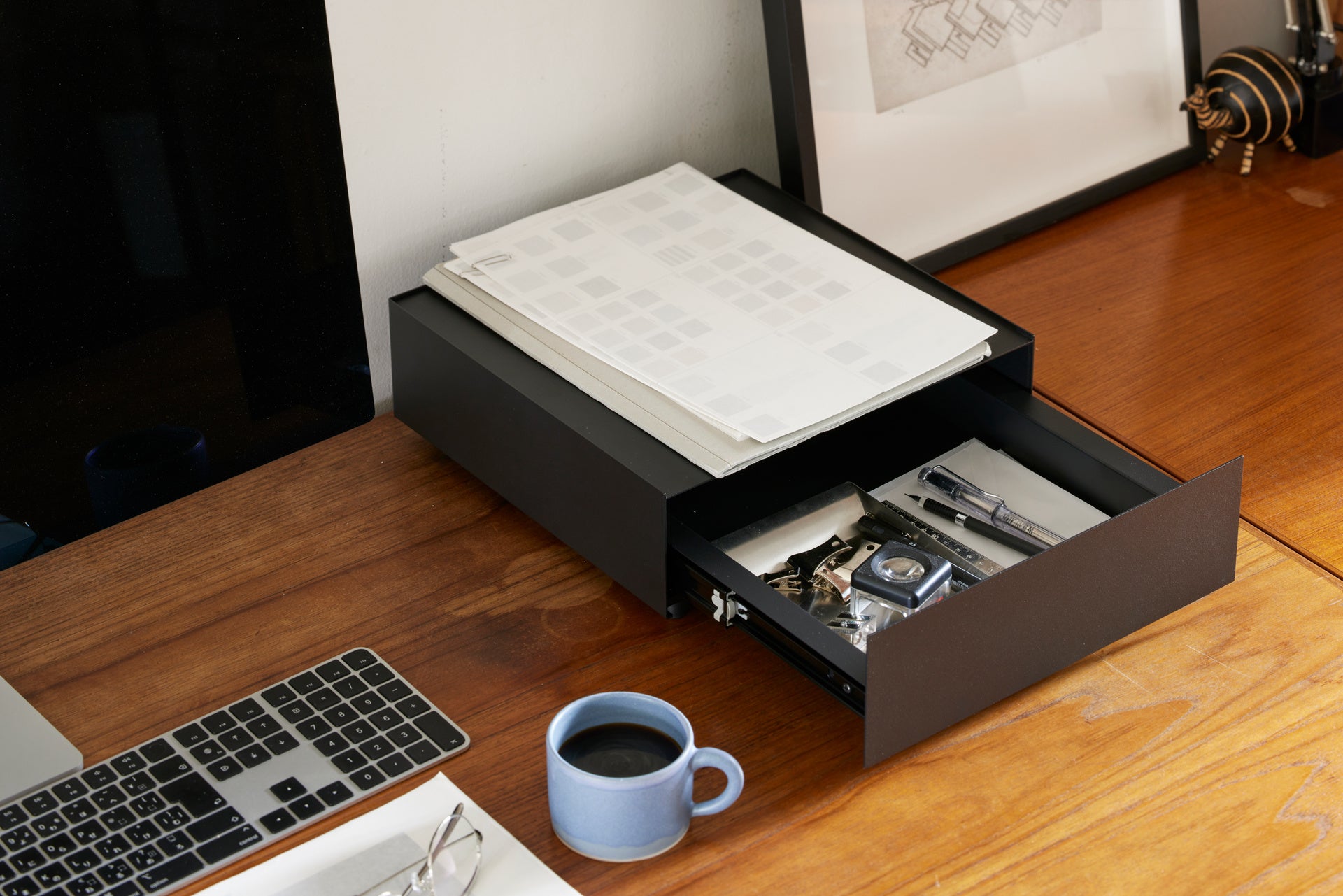 「お気に入りのものを飾りたい」「見せたくないものを隠したい」という2つの要求に、1つの場所で応えられるよう考案されたのが「KaKuKo」です。オフィス用キャビネットを長年作り続けてきたダイシン工業の技術を生かし、一段だけの引き出しに、十分な耐荷重性能を持つ天面を備え「みせる」と「かくす」が自然な形で同居する新しい収納システムを作りました。