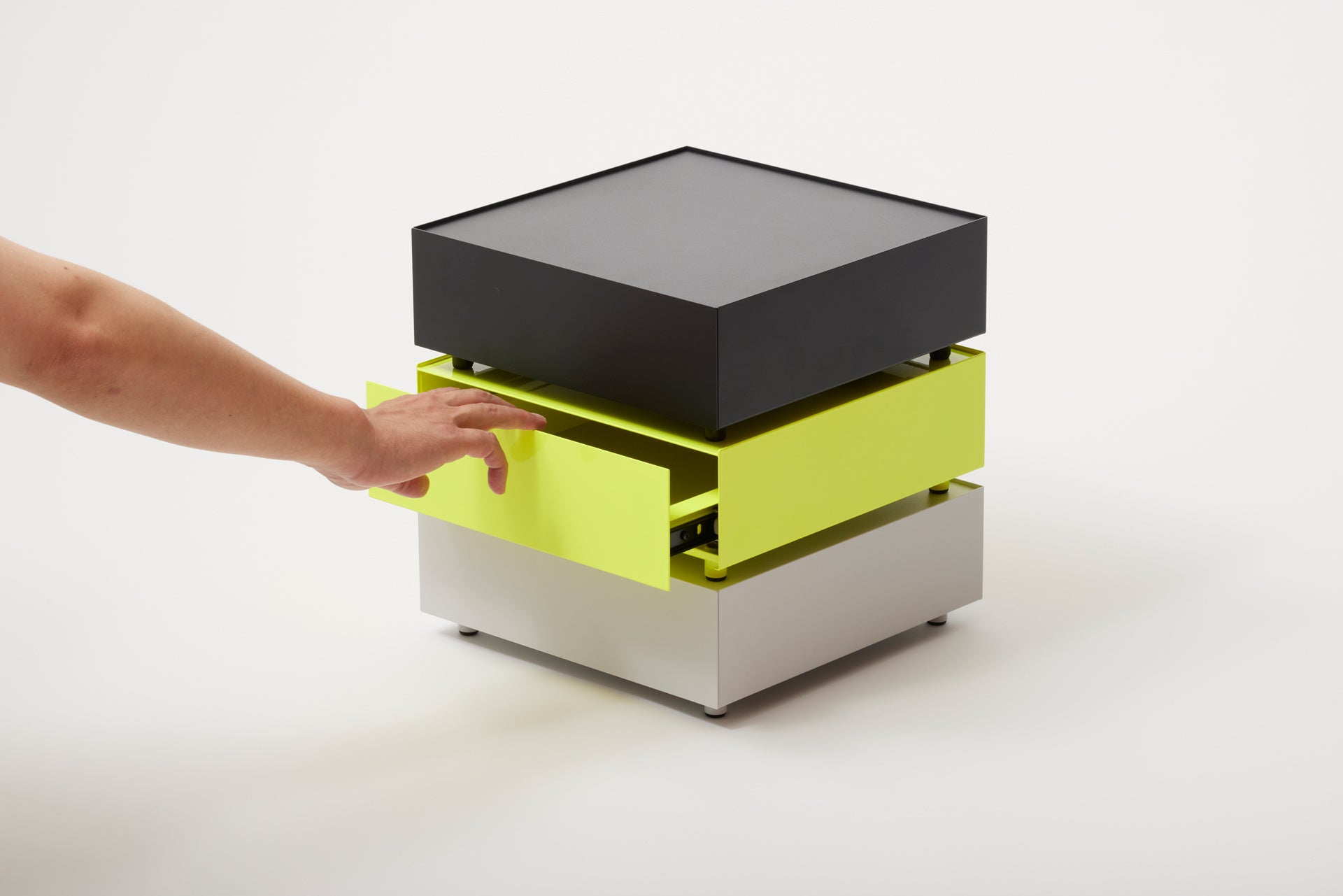 スチール性のオフィス家具は冷たくラフになりがちだが、従来のオフィスでは採用しないカラースキームと高度な技術力が融合し、佇まいの美しいインテリア家具に昇華されている。スチール板の小口が見えるシャープなデザインだが、見えない箇所での工夫で懸念される耐荷重性能も担保されている。単体の美しさは勿論のこと、重ねた時のノイズの少ないディテールの処理にデザイナーと技術者の力量をうかがい知ることができる。
