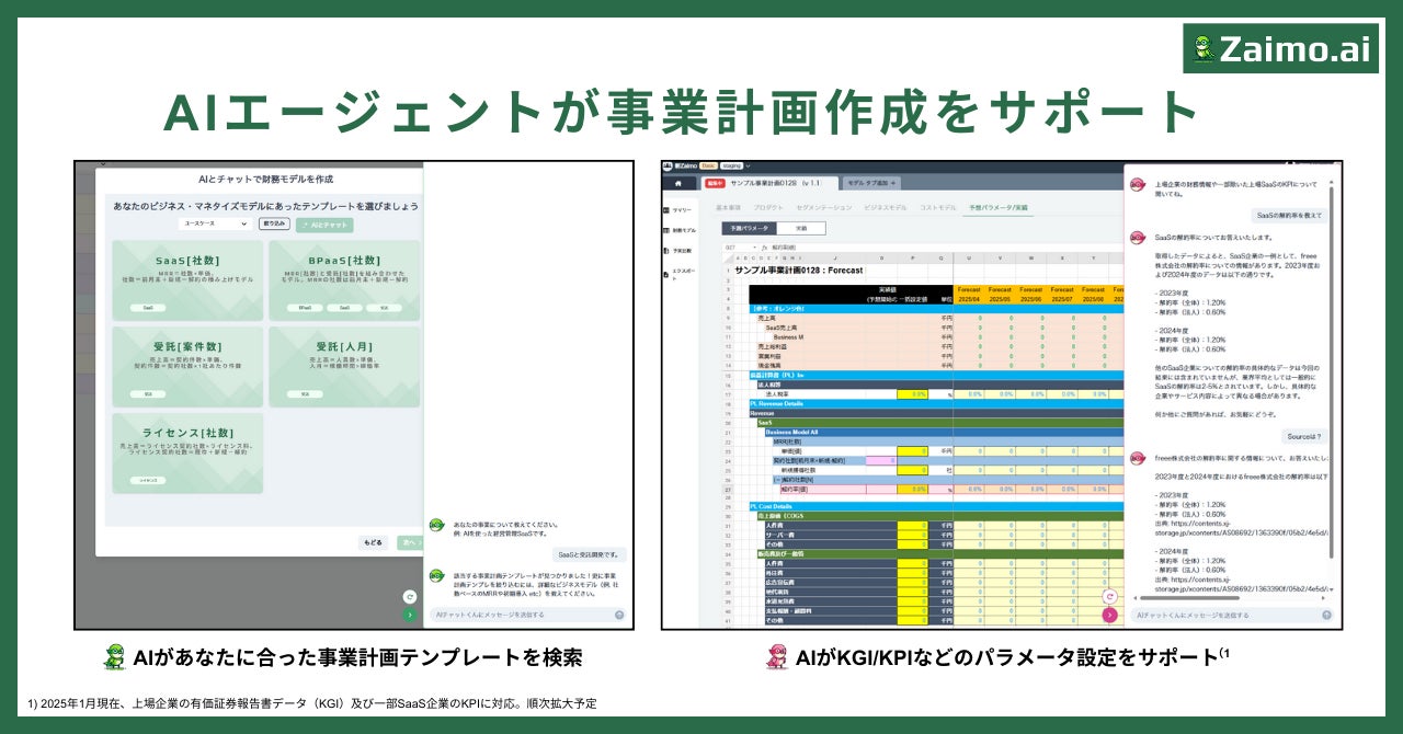 「Zaimo.ai」は誰でも簡単に数値(Excel)事業計画の作成や予実管理ができる次世代の経営管理プラットフォーム(Zaimo.aiで出来ること詳細:サービスサイト、note「経営管理AIエージェント 「Zaimo.ai」で”出来ること”と”凄いこと”」)で、この度、事業計画作成をサポートするAIエージェント機能(β版)を新たにリリースしたことをお知らせいたします。事業計画作成に慣れていない人でも簡単に事業計画を作成できるよう、AIエージェントがサポートしてくれるようになりました。誰でも無料でご利用可能(2週間のフリートライアル)なので、ぜひこちらからお試しください!