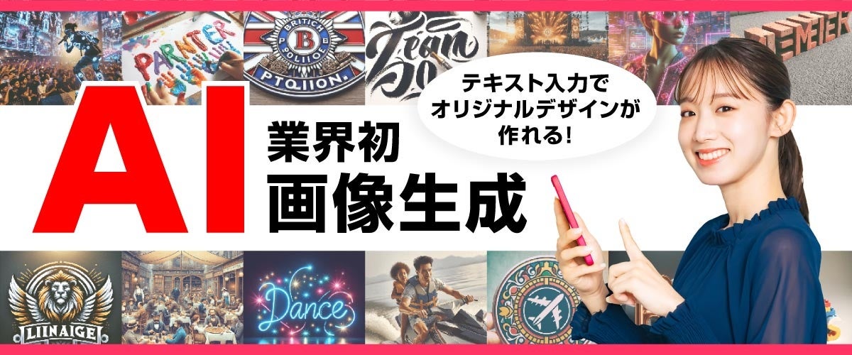 「AI」と呼ばれる人工知能に、作りたいイメージを指示するだけで、自動的に写真やイラストを作成するサービスです。イラストや写真はもちろん、刺繍のようなデザインやエンブレム風のデザインなど、どのようなデザインでもテキスト入力のみで画像生成が可能です。