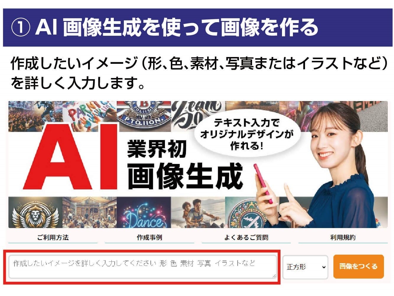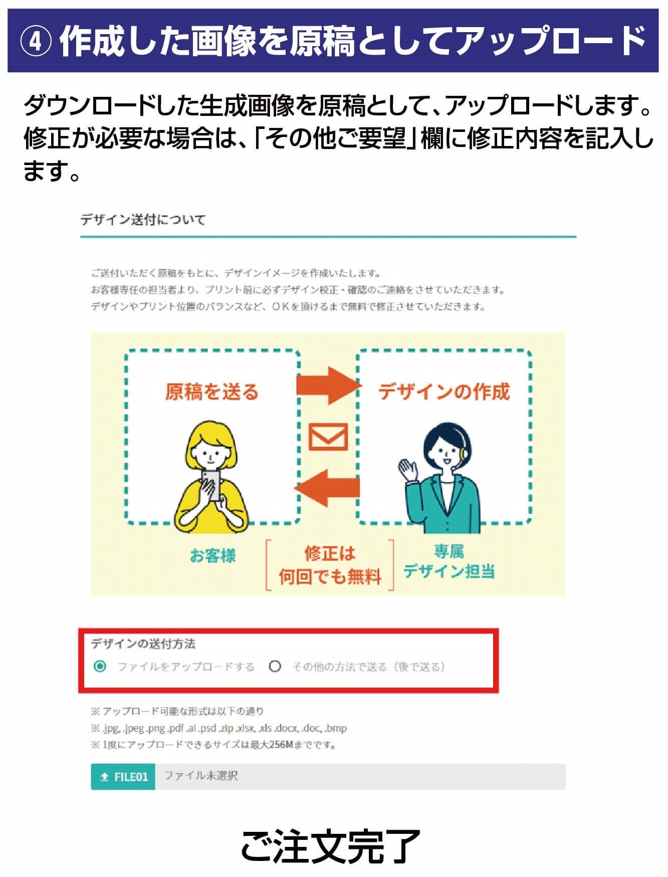 保存した生成画像を原稿として、アップロードします。生成した画像の修正も可能です。その際は「その他ご要望」欄に修正内容を記入します。