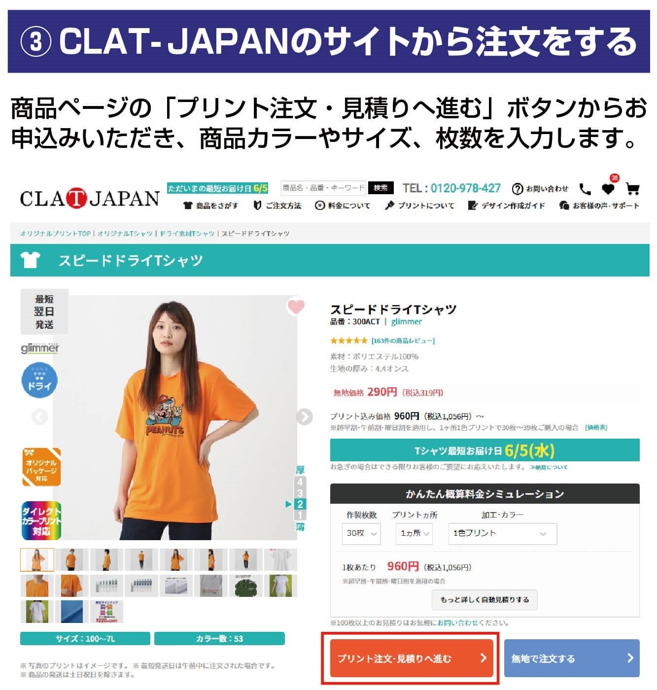 商品ページの「プリント注文・見積もりへ進む」ボタンからお申込みいただき、商品カラーやサイズ、枚数を入力します。