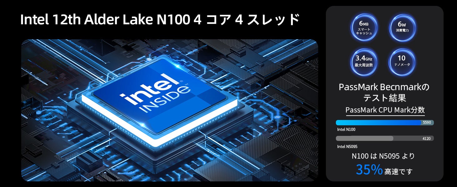 第12世代インテルAlder Lake N100 mini pc プロセッサーと高速16GBデュアルチャネルDDR4 SO-DIMMメモリ、超高速512GB SSDを組み合わせることで、起動時間の改善とアプリケーションプログラム起動の高速化を実現しています。ダウンロード、映画鑑賞、動画編集、デザインなど、ハードで効率的な作業に適しています。4コア4スレッド、6MBのキャッシュ、10nmの先進技術、パルス周波数3.4 GHz。