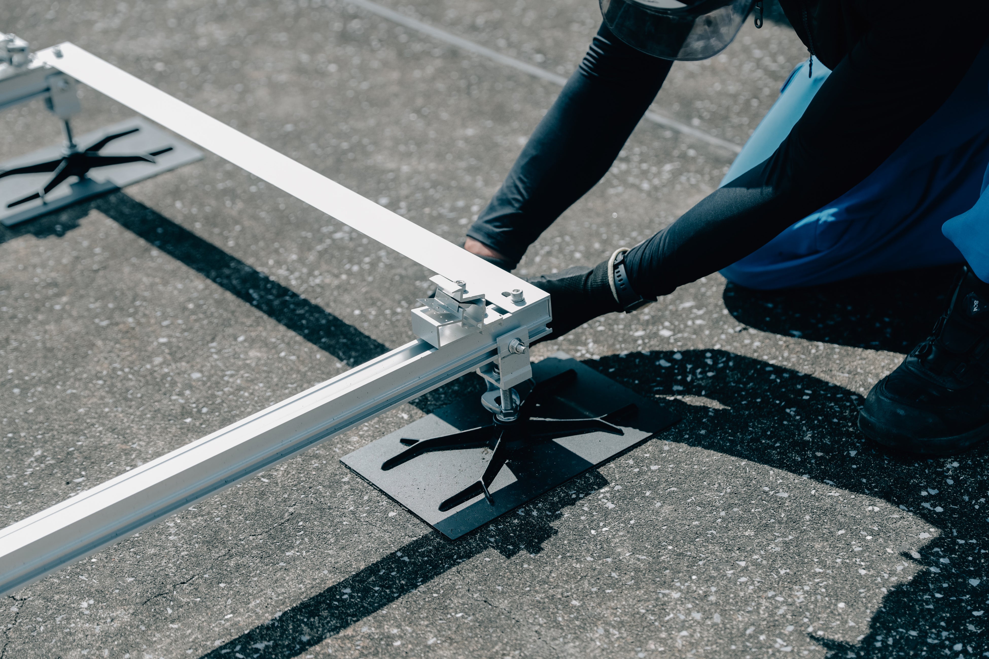 建物ごとに異なる勾配・段差・防水層の条件。防水保証を守りながらの固定。台風・地震に対して本当に安心できる強度設計。そして現場で職人が「ラクに、正確に」扱えること。