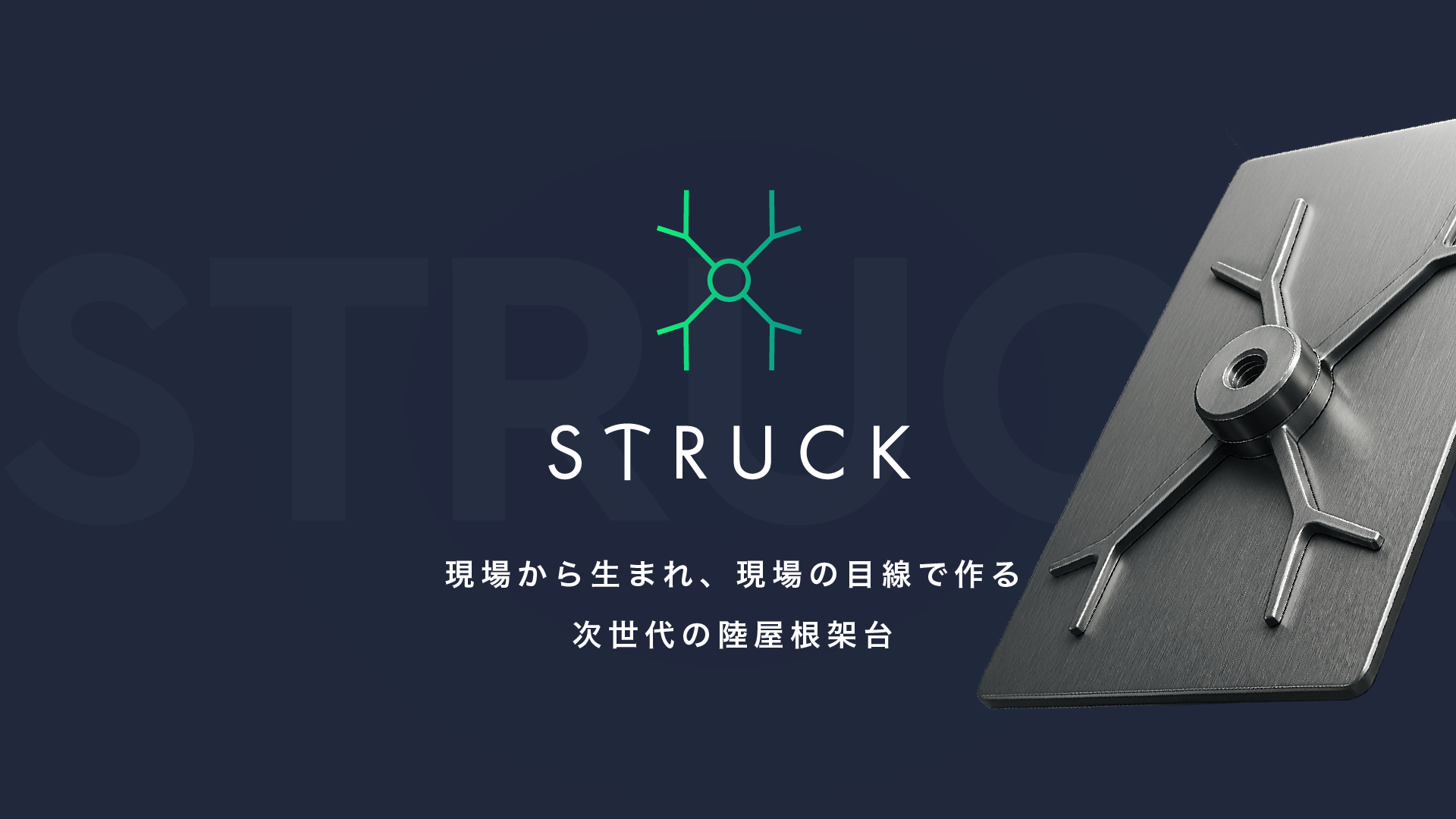 「STRUCK」はstructure(構造)× Rack(架台)の造語。「ストッ」とハマる調整のしやすさ、「ラク」に扱える施工性、そして struck=深く印象に残る という意味を一語に込めました。