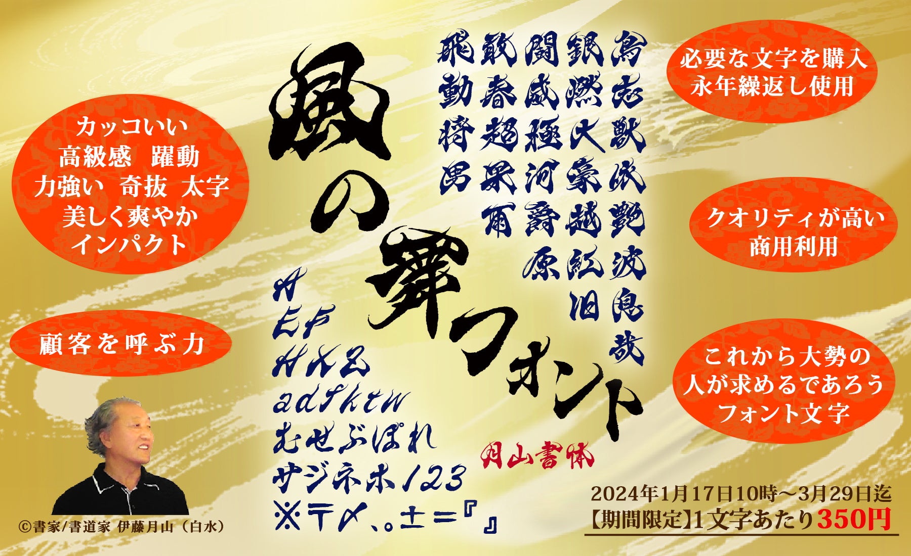 「筆文字デパート」のサイトにて、古典から得た独自性の高い月山(がっさん)書体「風の舞」を、期間限定特別価格の1文字あたり350円で販売いたします。