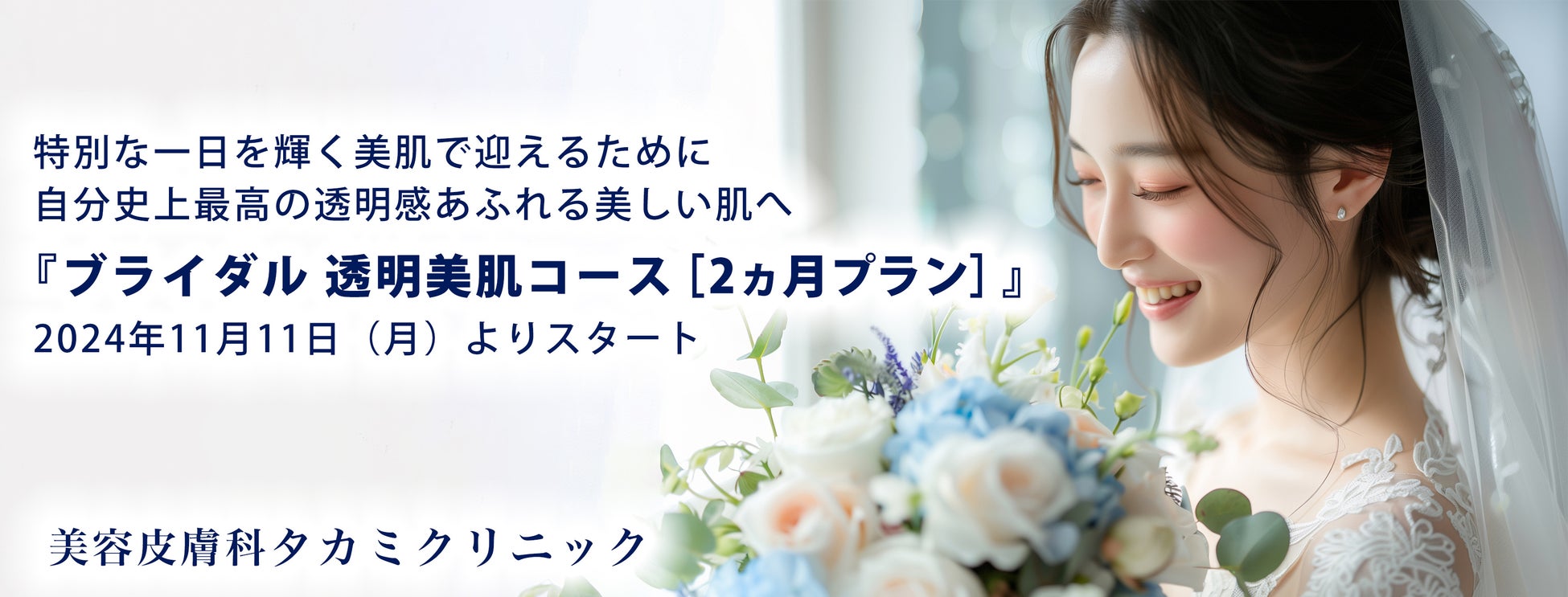 1999年開院、45万人以上の治療実績を誇る美容皮膚科タカミクリニック(東京都港区南青山/院長 高見 洋)は、結婚式当日を透明感あふれる美肌で迎えたい花嫁様のために、美容皮膚科医がダウンタイムや痛みの心配がない施術を厳選して組み合わせた、特別な一日を輝く美肌で迎えるための新メニュー「ブライダル 透明美肌コース[2ヵ月プラン]」を、2024年11月11日(月)よりスタートいたします。