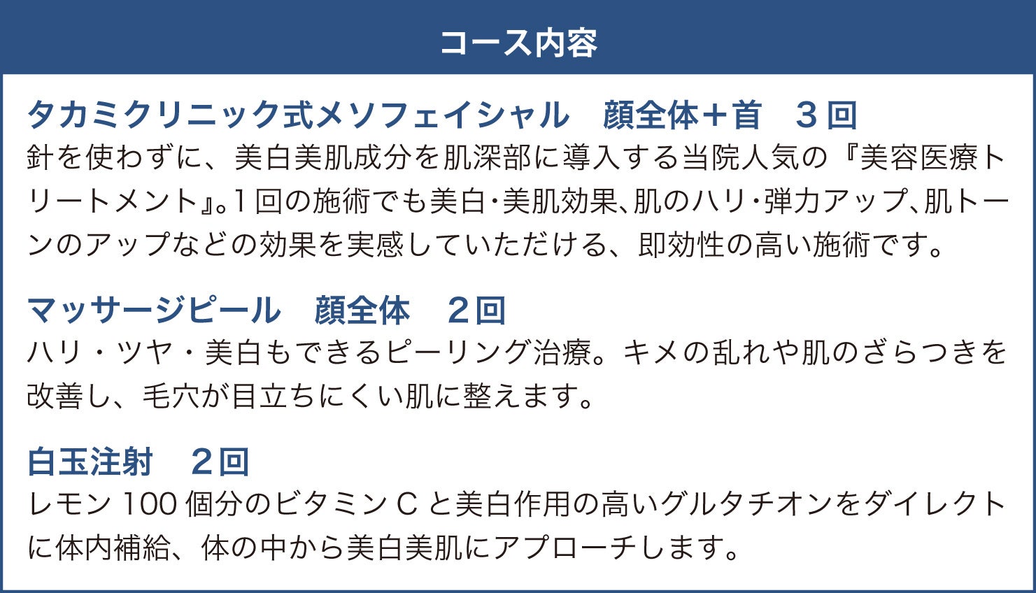 タカミクリニックこだわりの美白・美肌成分を痛みなく肌の深部まで導入する“美容医療スキントリートメント”です。医療機関でしか使用できない高性能エレクトロポレーション機器と、日本人の肌に合わせて開発したタカミクリニックオリジナル導入剤の相乗効果で、1回の施術でも肌のハリ、弾力、小じわの改善、美白効果を実感していただける即効性の高い施術です。ビタミンC誘導体の美白美肌効果を最大限に発揮できるよう、2種類のビタミンC誘導体を施術直前に調合して使用します。