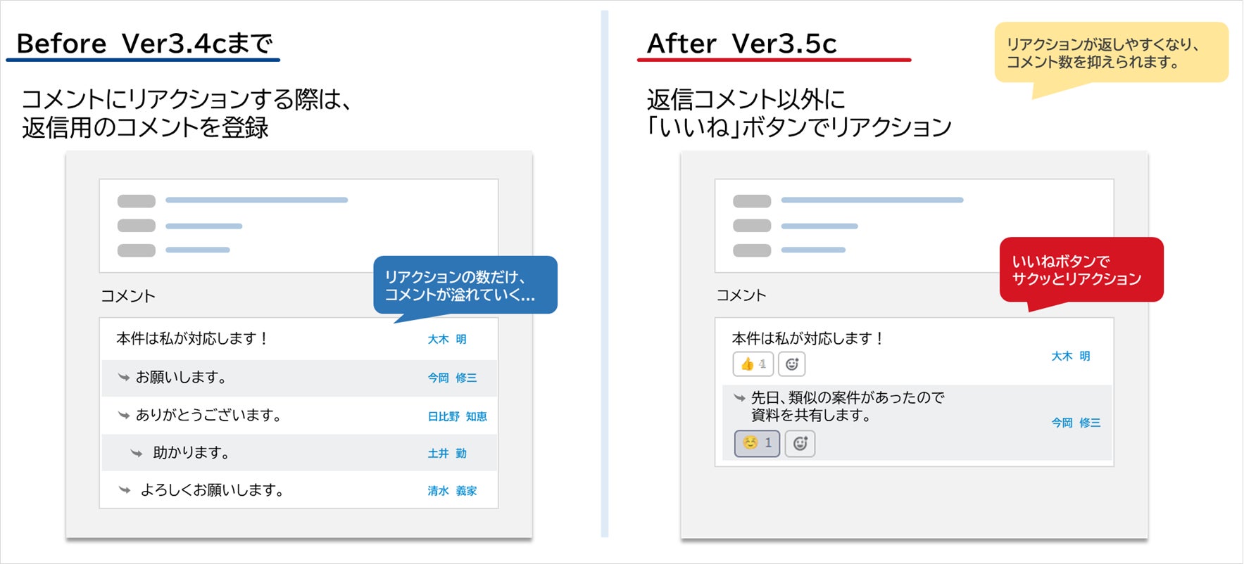 Ver3.4cまでは、コメントが登録されると関係者全員に通知が届いていましたが、Ver3.5cでは、コメントの宛先を指定できるようになりました。これにより、指定されたユーザーにのみ通知が届き、重要なコメントの見逃しを防止します。また、指定されないユーザーへの不要な通知を省き、効率化します。