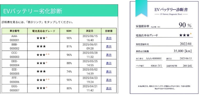 パナソニックグループは、長年にわたるバッテリーの研究開発やエネルギーソリューション領域での豊富な経験を通じて、EVバッテリーの劣化度合いを診断・可視化する技術を培ってきました。特にEV普及で先行する海外市場においてバッテリー分析やソリューション提供の実績を重ねています。従来の診断技術では、バッテリーを充放電させてデータを取得する必要があったため、診断に時間を要していましたが、本実証実験で利用する技術では、充放電不要のため、10秒ほどの診断時間で結果を出力できます。また、バッテリー情報から計算されたSOHに加え、これまでの知見を応用した各車種のバッテリー寿命傾向の独自指標も提示することで、中古EVの価値判断に有用な情報を提供します。本実証実験を通じてパナソニックHDの技術がEV市場の活性化に貢献できることを目指しています。