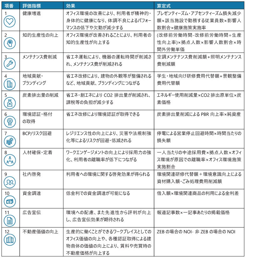 昨年12月時点で未発表としておりました「地域貢献・ブランディング」「環境認証・格付の取得」「社内啓発」「資金調達」の4項目について定量化のロジックを作成しました。