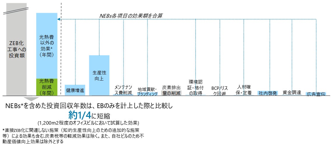 自社ビルのZEB 化に取り組んでいるダイダン株式会社(代表取締役社長:山中 康宏、以下「ダイダン」)と引き続き連携し、ダイダンが所有するZEB 認証取得3 棟(ZEB Ready1 棟含む)において、今回見直しを行ったロジックを活用してNEBs の再検証を行いました。検証の結果、エネルギー消費量のみの投資回収年数に比べ、NEBs を含めた投資回収年数は約1/4 となることが推計され、ZEB に取り組むメリットを定量的に評価することができました。