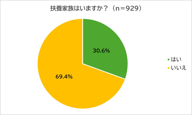 まず、「扶養家族はいるか?」訊いたところ、「はい」(30.6%)、「いいえ」(69.4%)となりました。