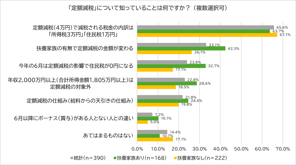 「定額減税の実施を知っている」と回答した390人(あり:168人、なし:222人)それぞれに、「『定額減税』について知っていることは何か?」訊きました。扶養家族の有無にかかわらず最多は「定額減税(4万円)で減税される税金の内訳は『所得税3万円』『住民税1万円』」(統計:65.6%、あり:63.7%、なし:67.1%)、続いて「扶養家族の有無で定額減税の金額が変わる」(統計:33.1%、あり:42.3%、なし:26.1%)となりました。また、全体的に扶養家族ありの方がなしよりも詳しいこともわかりました。