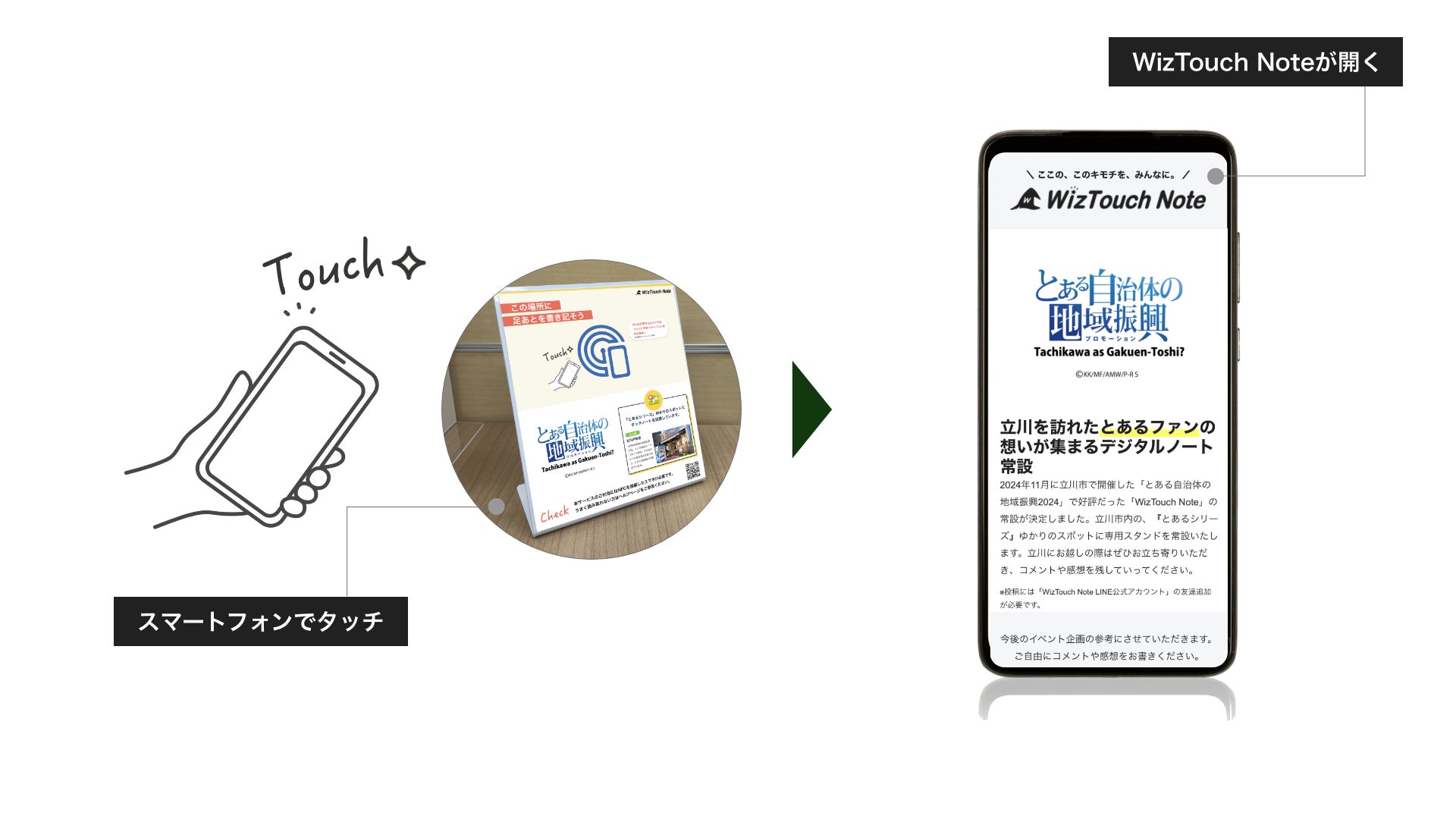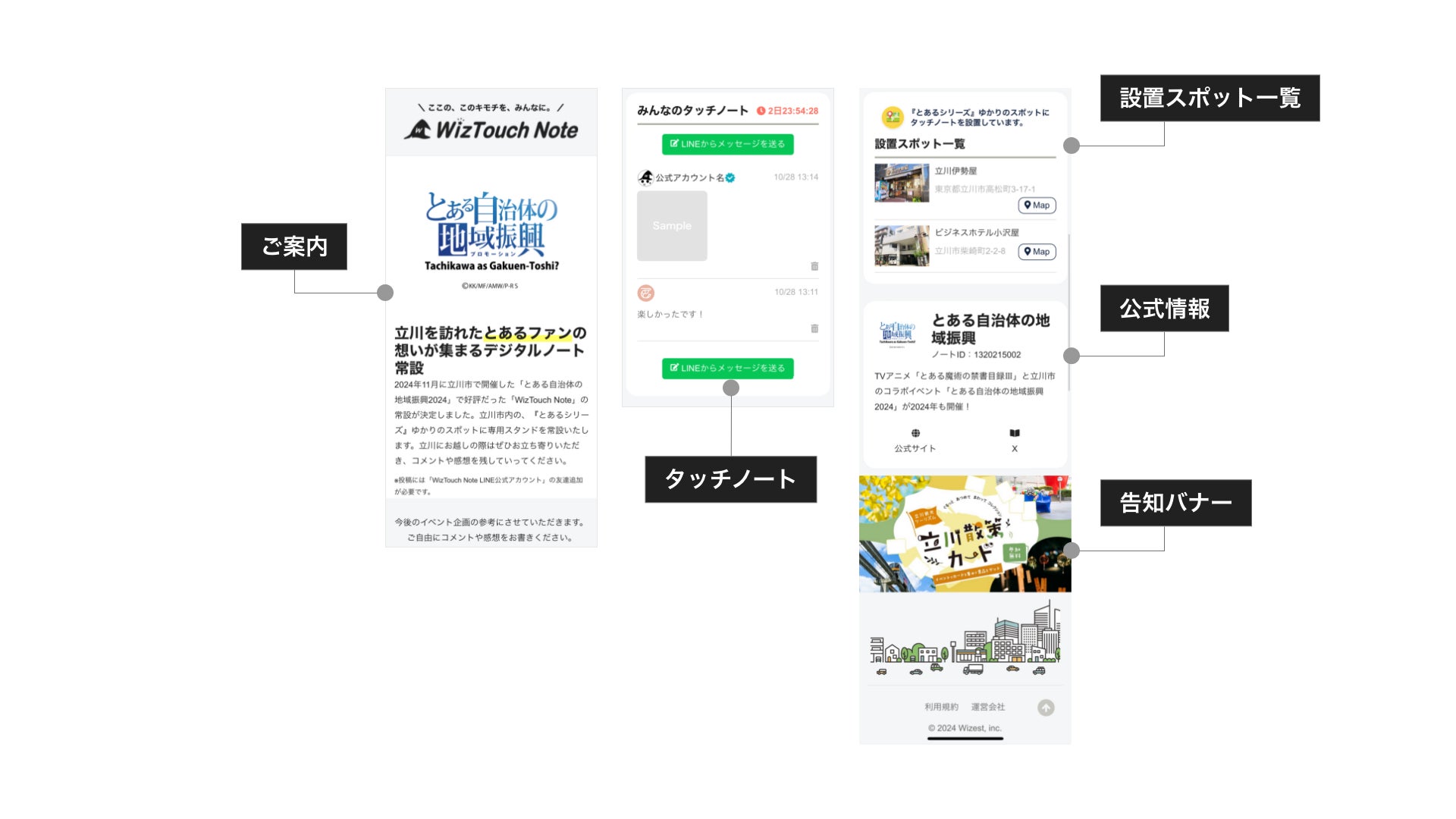 さらに一般的なSNSとは異なり、炎上リスクがない設計で、利用者同士が程よい距離感でつながれる「うちわ感覚」のコミュニケーション空間を提供。「立川に来た人だけ」が共有できる特別な空間をお楽しみください。書き込まれたコメントや感想は今後のイベント企画や地域振興のアイデアに活用される予定です。「WizTouch Note」を通じて生まれる新しい聖地巡礼をぜひ体験してください。