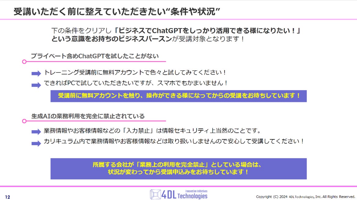 4DL Technologies 株式会社(本社:千葉県千葉市、代表取締役CEO兼CTO:荒巻 智隼、以下「4DL」)は、《非エンジニア向けに実務でChatGPTを活用するための実践型リスキリングプログラム【ANT-B1】》を2024年10月より提供開始します。