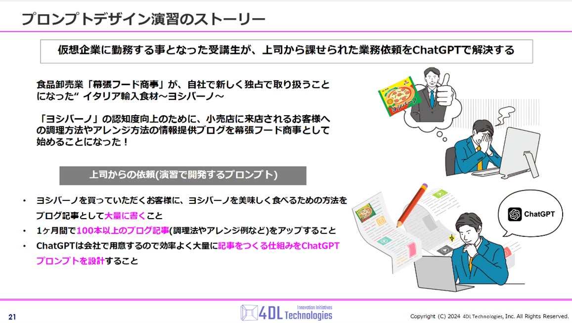 4DLプロンプトデザインのワークショップ、受講生は仮想企業の社員として上司からの依頼により、新規事業のコンテンツマーケティングになっています。