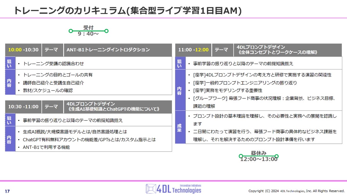 ※ANT = AI Native Trainingは、4DLのChatGPTソリューションプロダクトのビジョンでもある《AIを自在に操れるヒトとチーム = AI Native》の研修を意味します。