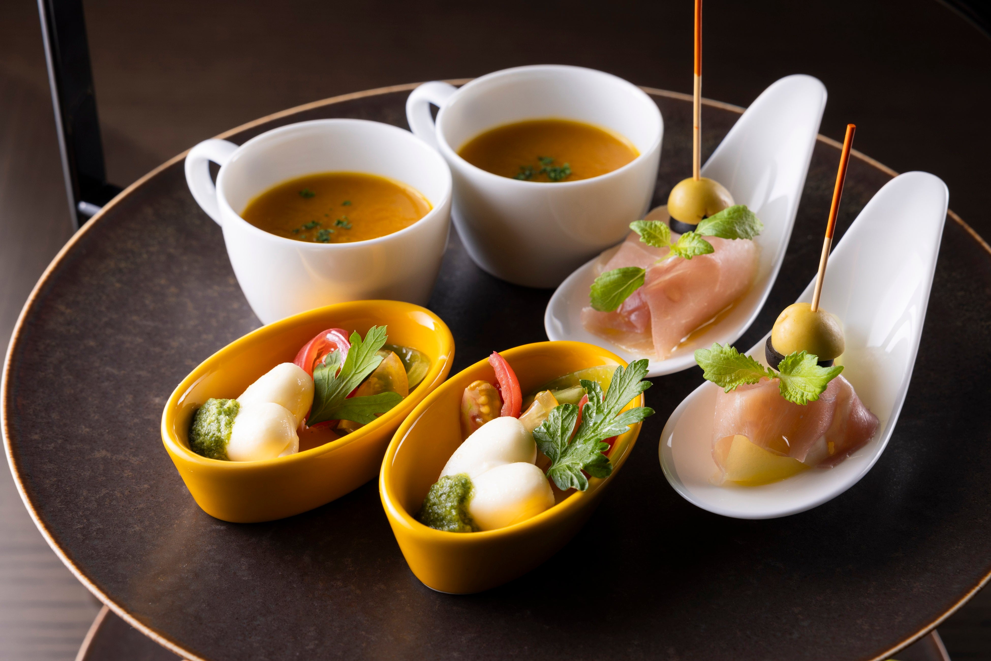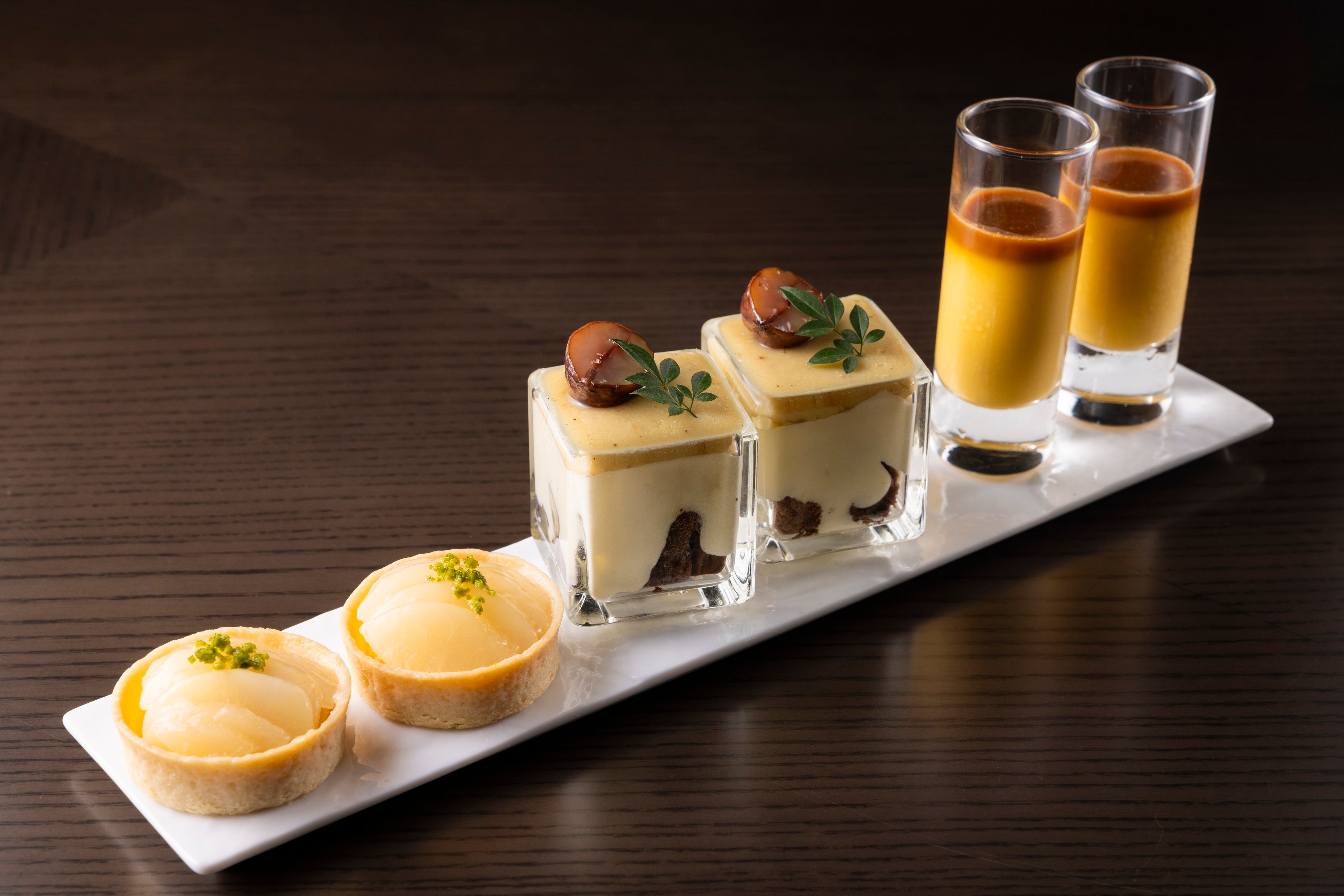 お食事のメニューには、可愛らしいハート型のチーズを使用したトマトとハートのカプレーゼ、真鯛のカルパッチョ、ハモンセラーノとメロン、秋にぴったりな温かいパンプキンスープなど一口サイズで6種類ご用意し、2段スタンドでご提供いたします。メインディッシュには総料理長おすすめのジューシーな国産牛のローストビーフをお楽しみください。またデザートには濃厚な栗の味わいが魅力のティラミスモンブランをはじめパンプキンプリンや洋梨のタルトなど3種類もついており、ハイティーは、合計10種類の豪華なラインナップです。